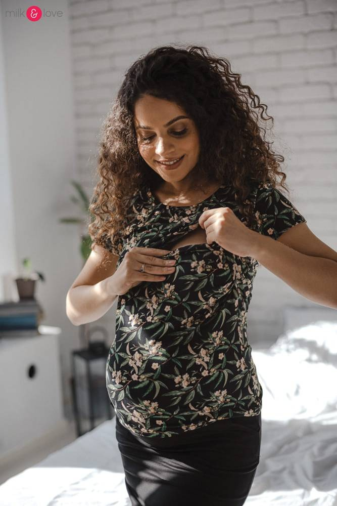 Milk Shirt Bluzka do karmienia i ciążowa z krótkim rękawem Milk&Love w listki na czarnym