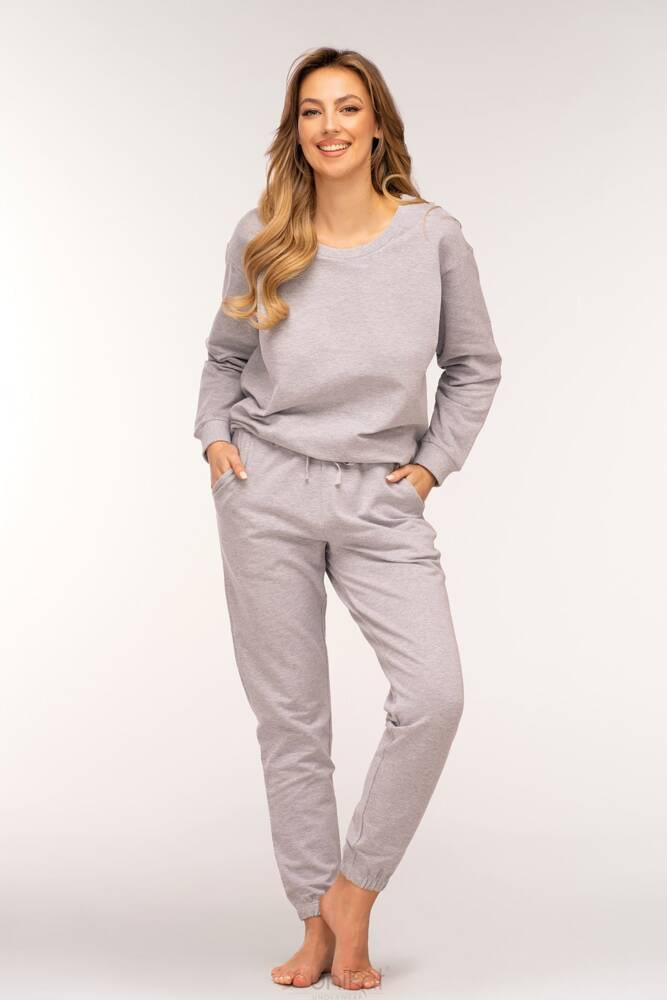 Komplet, która składa się z bluzy zakładanej przez głowę i spodni. Idealny zarówno do domowego leniuchowania i na wyjście na miasto. Bluza jest luźna i dzięki temu bardzo wygodna. Spodnie mają luźny krój a przy tym wpisują się w najmodniejsze trendy. Materiał jest gładki i wytrzymały. Aby komplet na długo zachował swój świetny stan, należy go prać według zaleceń na metce.