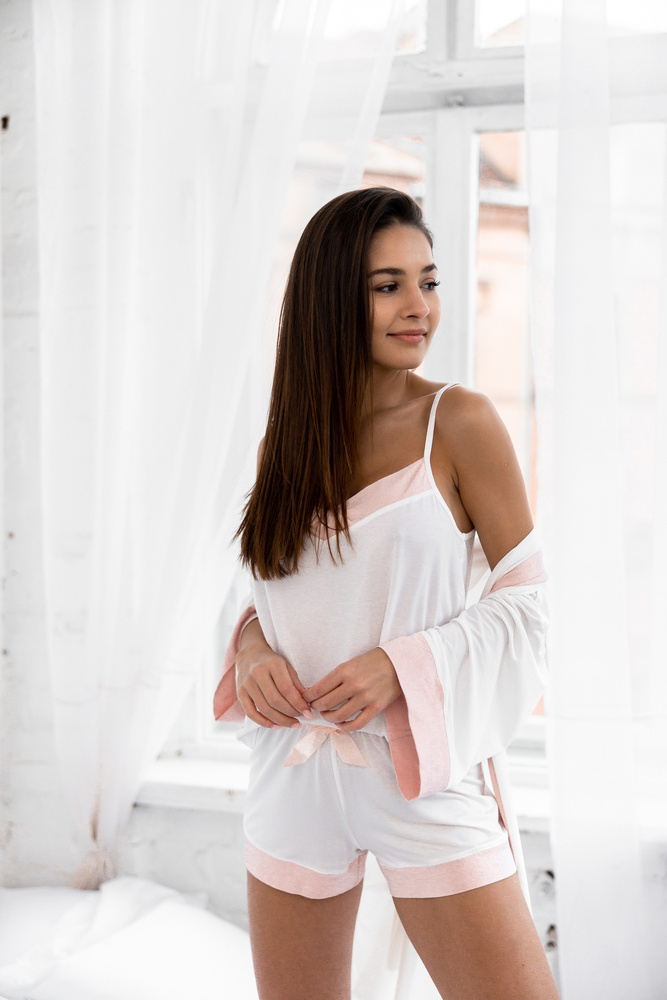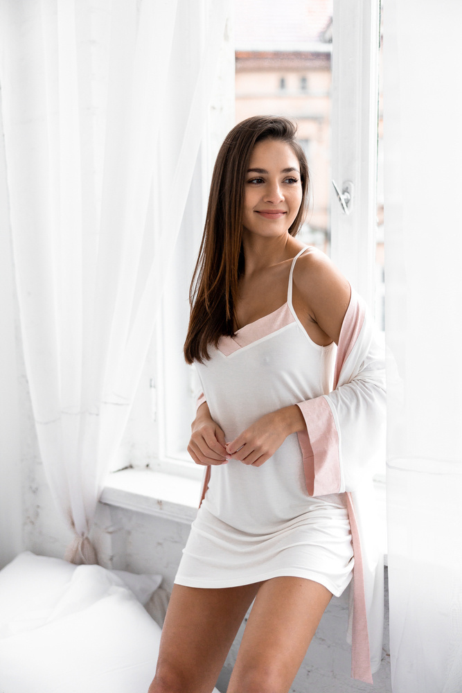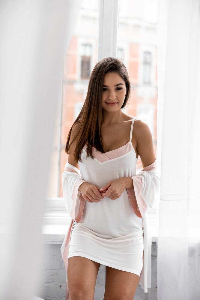 Szlafrok damski wykonany z wiskozy. Model wykończony lamówką z przodu i na mankietach. Kopertowy fason z paskiem świetnie dopasowuje się do sylwetki. Szlafrok idealnie komponuje się z koszulą bądź piżamą dostępną w naszej kolekcji bielizny nocnej. W szlafroku możesz zachwycać i olśniewać swoją urodą, nawet jeśli tylko wybierasz się w nim do sypialni.
