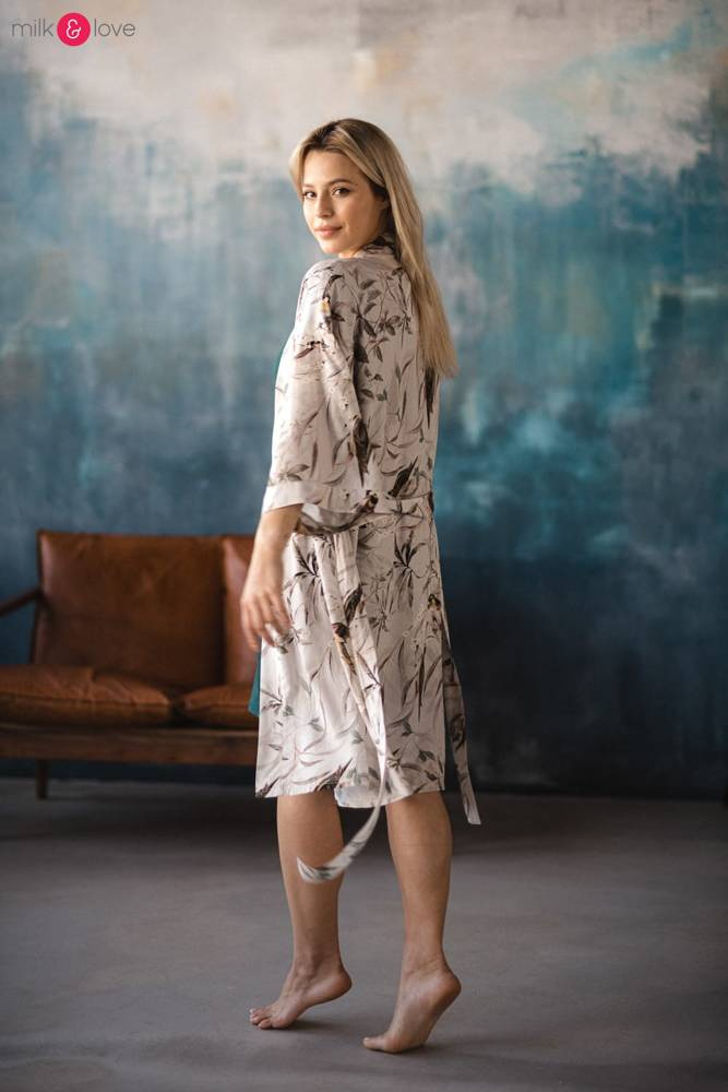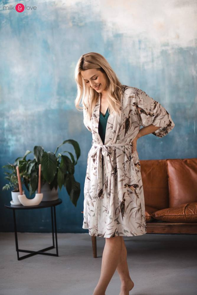 Szlafrok został zaprojektowany z myślą o mamach, dlatego jest nieco dłuższy, abyś spokojnie okryła nim ciążowy brzuszek. Po porodzie bez skrępowania b będziesz mogła spacerować po szpitalnym korytarzu lub na leżąco nakarmiła maluszka w połogu. Posiada kieszenie na niezbędne drobiazgi i pasek do regulowania szerokości.