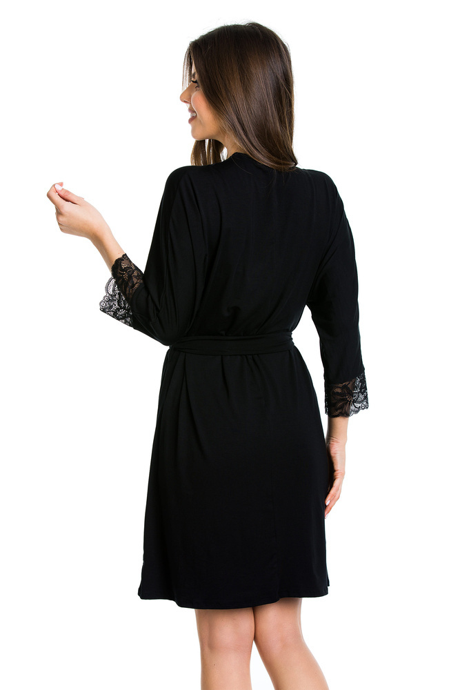 Efektowny długi szlafrok damski, idealny dla każdej eleganckiej kobiety. Wykonany z wiskozy, dekolt z koronką, pas zakładany kopertowo, wiązanie w talii na wiskozowy pasek.