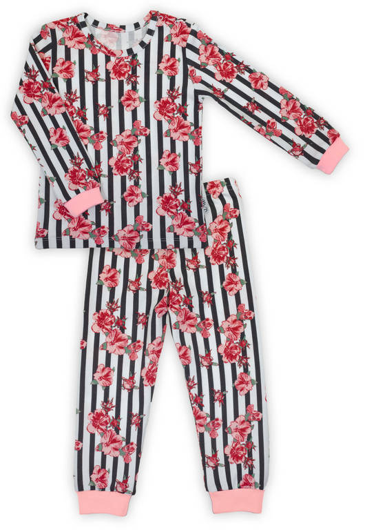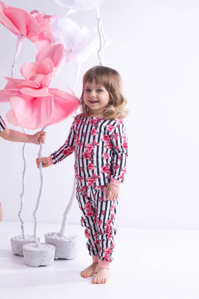 Bawełniana piżamka, z luźną bluzką z długim rękawem, wykonana z wzorzystego materiału. Spodnie posiadają w pasie wygodną gumkę, nie uciskającą brzuszka, dodatkowo została przeszyta, aby zapobiec okręcaniu się. Dół nogawek zakończono ściągaczem. Bluzka do rozmiaru 104 zapinana jest na bezniklowe napy. Bawełna, z której jest uszyta, posiada certyfikat Oeko-Tex Standard 100 Tekstylia godne zaufania.