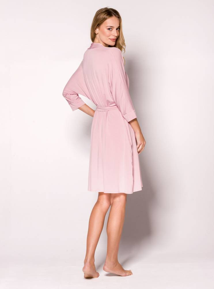 Szlafrok damski z wysokiej jakości wiskozy 94% z dodatkiem elastanu. Krótki, wiązany w pasie, z kieszeniami.Tworzy idealny komplet z koszulką lub piżamą z kolekcji Babella.