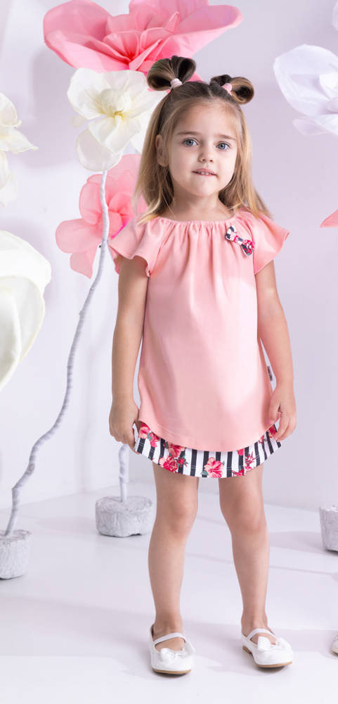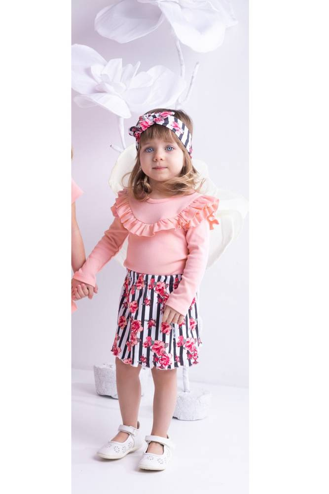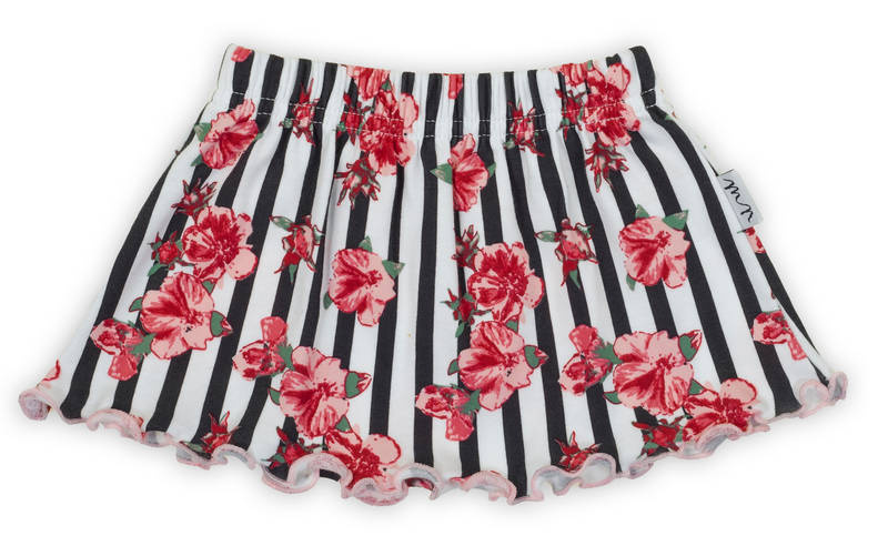 Wygodna, spódniczka w paski. Ozdobiona wzorem w kwiaty.