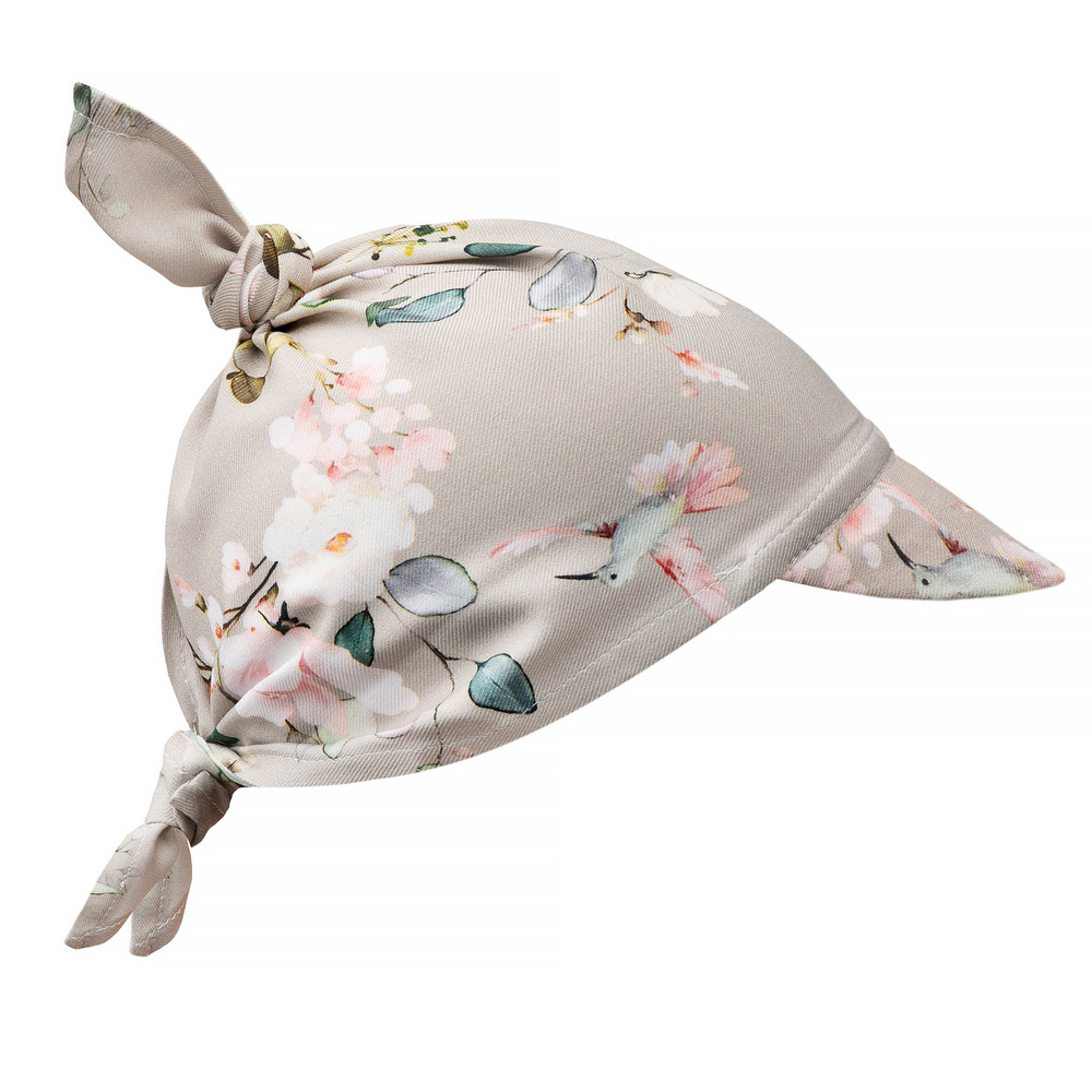 Chusteczka posiada daszek, który dodatkowo chroni przed słońcem buźkę Maluszka. Daszek można wywinąć, lub zostawić na płasko. Chustka jest wiązana na supełki, dzięki czemu można delikatnie regulować jej obwód. Dopasuje się w ten sposób do maluszków w każdym wieku.