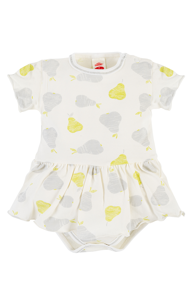 Stylowe sukienko-body z krótkim rękawem dla dziewczynki we wzór owoców. Wykonane z materiału posiadającego certyfikat Oeko-Tex Standard 100 Tekstylia godne zaufania.