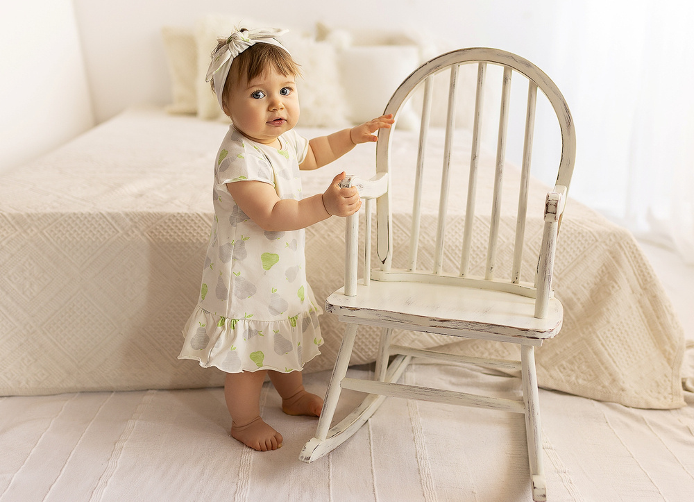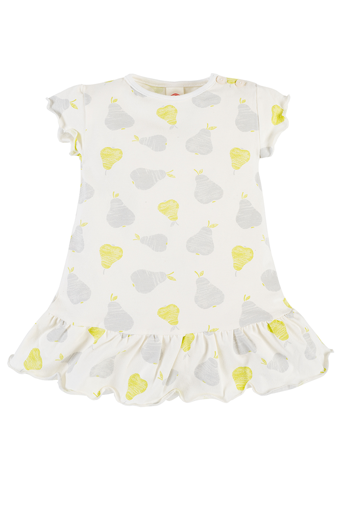 Sukienka dla małej księżniczki z kolekcji Sweet Pears. Została uszyta z miękkiej i przyjemnej w dotyku tkaniny. Dzięki rozkloszowanemu krojowi jest bardzo wygodna i przewiewna.