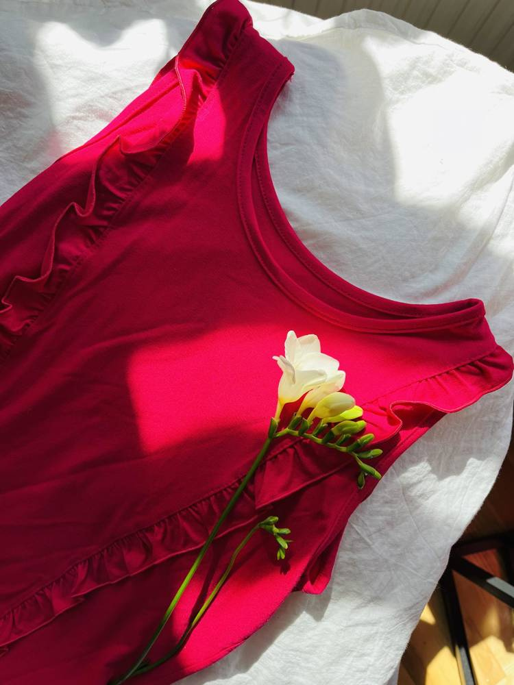 Elegancka koszulka damska na szerokim ramiączku. Model wykonany z wysokiej jakości jedwabiu wiskozowego. Dekolt i talia ozdobione uroczą falbanką. Spodoba się kobietom, które uwielbiają delikatność i swobodę.