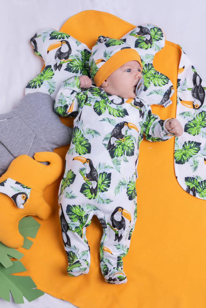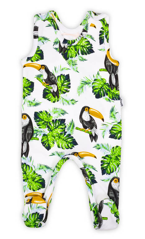 Komfortowe śpioszki dla chłopca z kolekcji Tukan. Wykonane z wzorzystej bawełny. Posiadają ramiączka zapinane na bezniklowe napy, co sprawia że ubranko nie będzie się zsuwało .Napy zastosowano również w kroku ,aby ułatwić przewijanie dziecka. Produkt bezpieczny dla dziecka, posiada certyfikat Oeko-Tex Standard 100 Tekstylia godne zaufania.