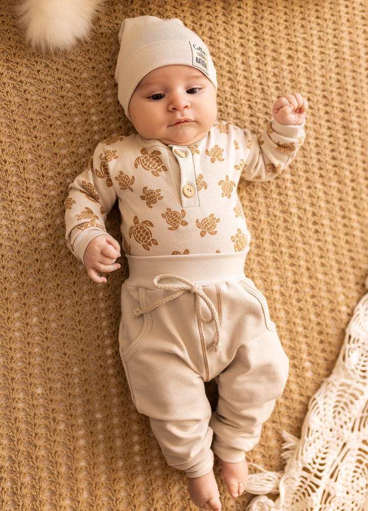 W pasie wszyta jest nieuciskająca gumka, która utrzymuje ubranko na miejscu. Krój zapewnia maluchowi komfort noszenia i nie krępuje ruchów.
