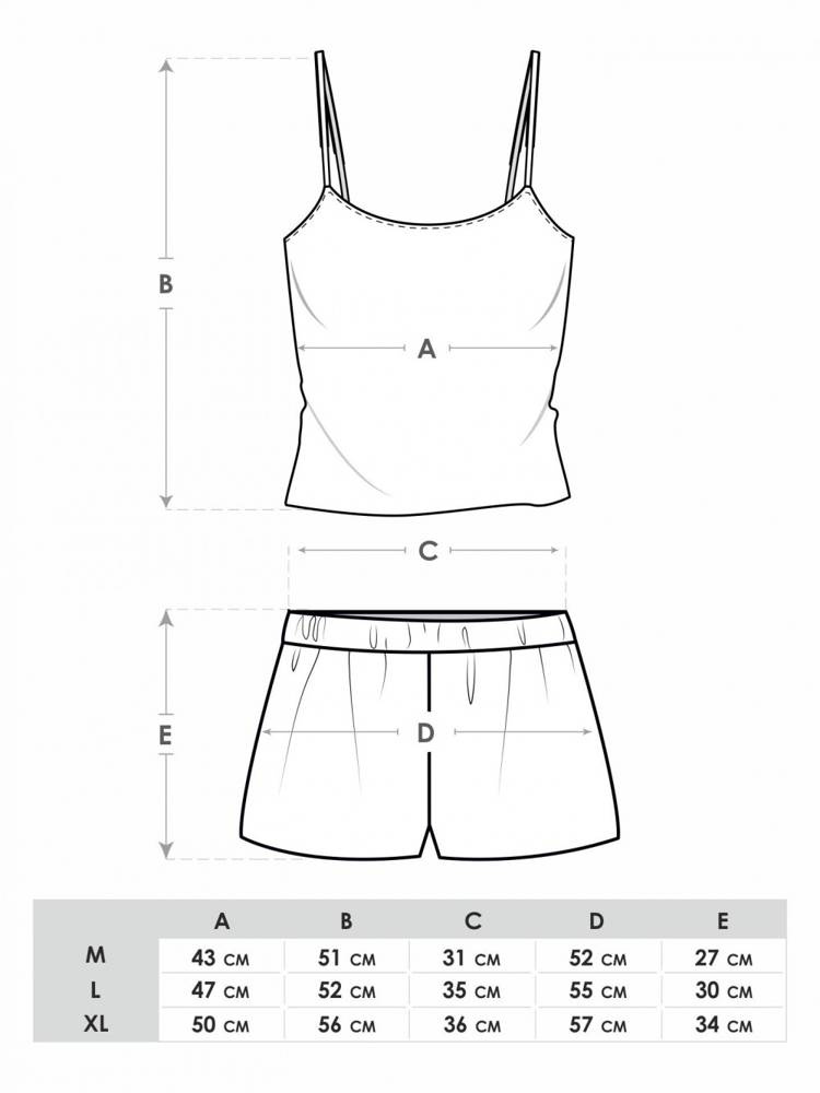 Wygodne i komfortowe piżamy nie muszą być nudne! Ciekawe wzornictwo i kolorystyka są niewątpliwą zaletą. Model z wysokiej jakości, miłej w dotyku satyny. Dekolt typu V, bluzka na ramiączkach. Spodenki krótkie, wykończone komfortową gumką w pasie. Bardzo wygodny fason, delikatnie dopasowany do ciała. Spodoba się kobietom, które uwielbiają delikatność i swobodę.
