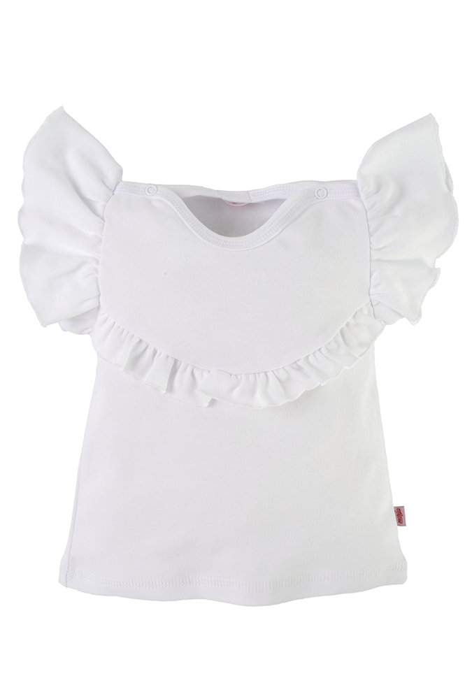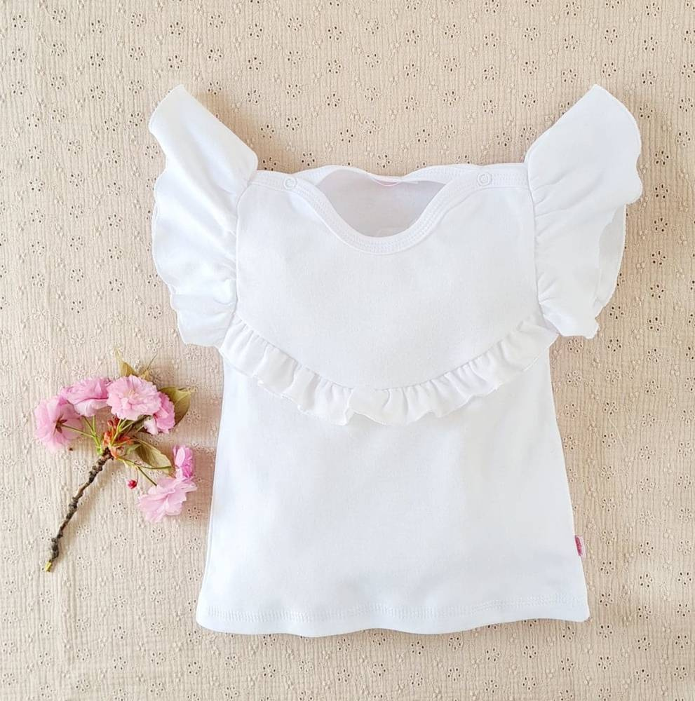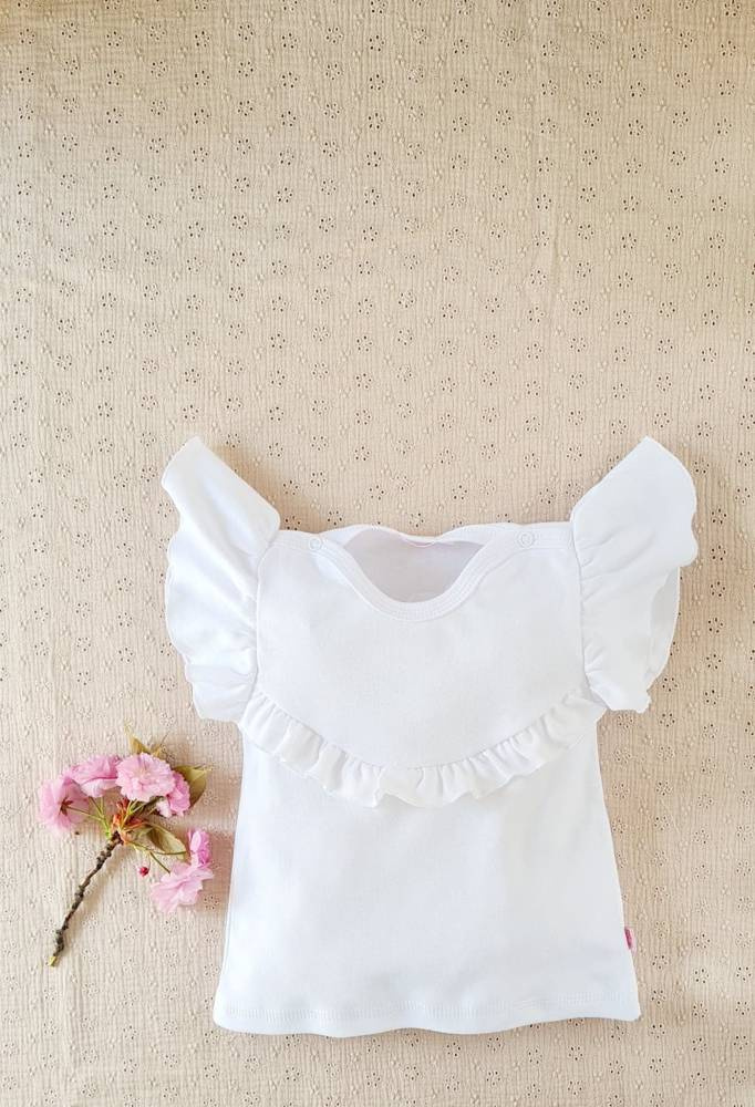 Urocza bluzka z kolekcji Cherry. Model z krótkim rękawem. Posiada ozdobną falbankę. Wykonana z miękkiej i wygodnej bawełny 100%. Zapinana jest na antyalergiczne napki co ułatwia ubieranie.