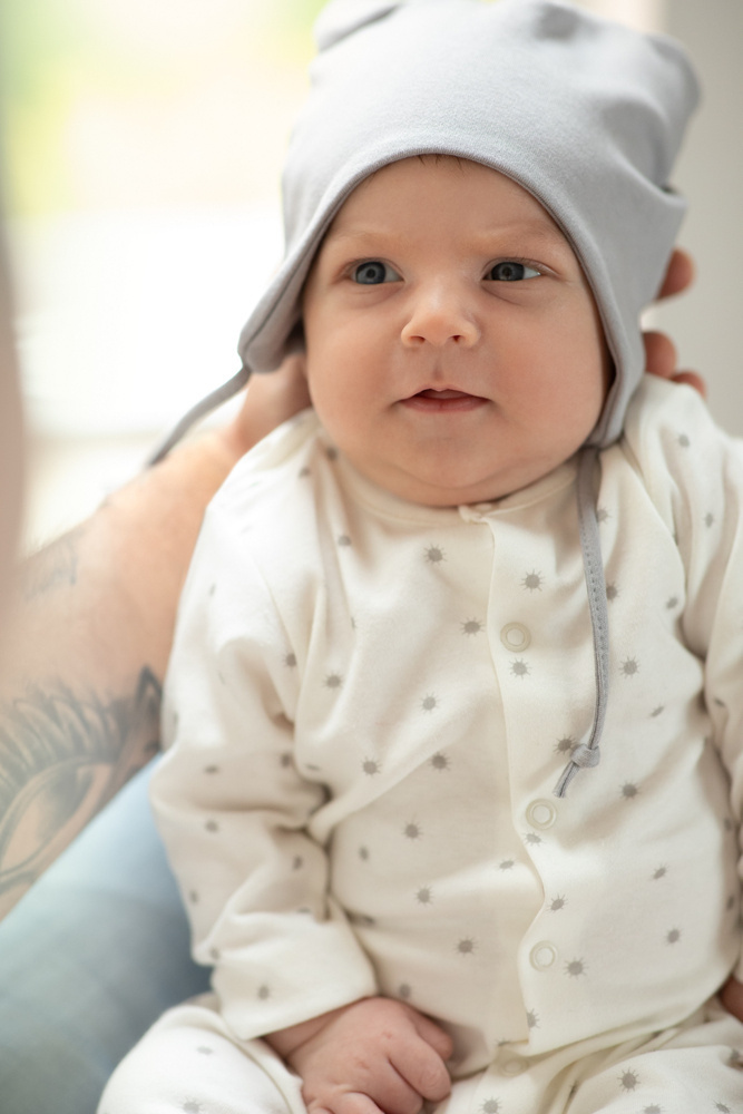 Bawełniana czapka wiązana dobrze przylega do główki, dzięki czemu zapewnia maluchowi ochronę uszu przed chłodem.