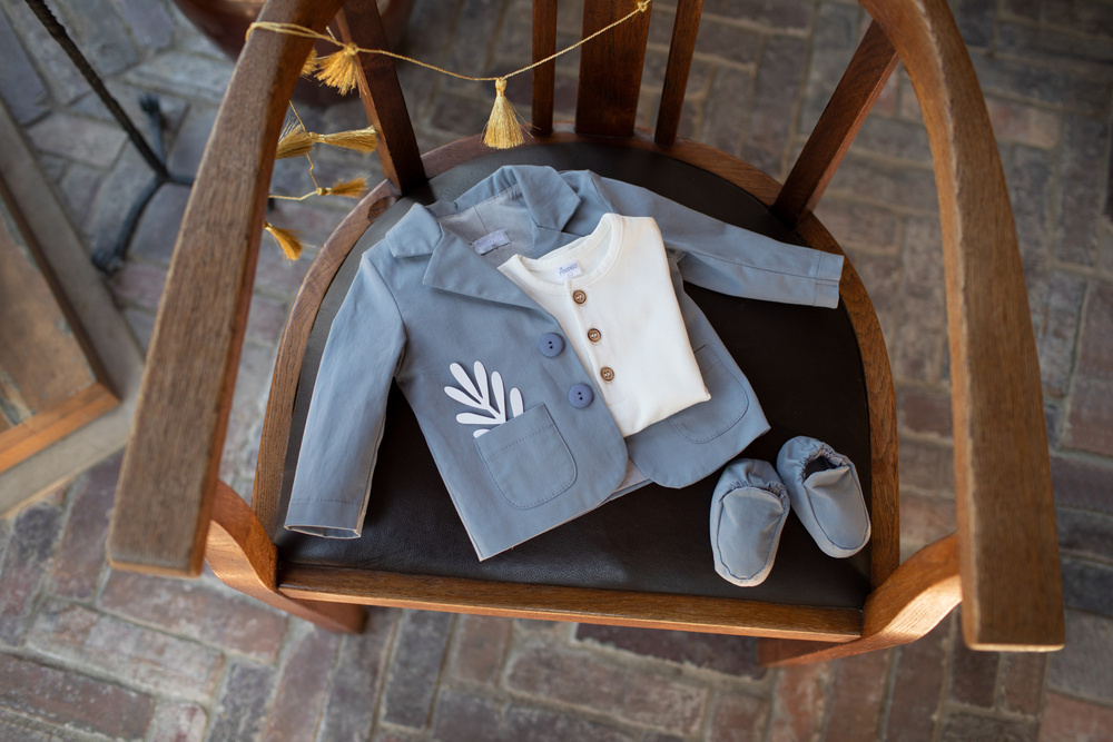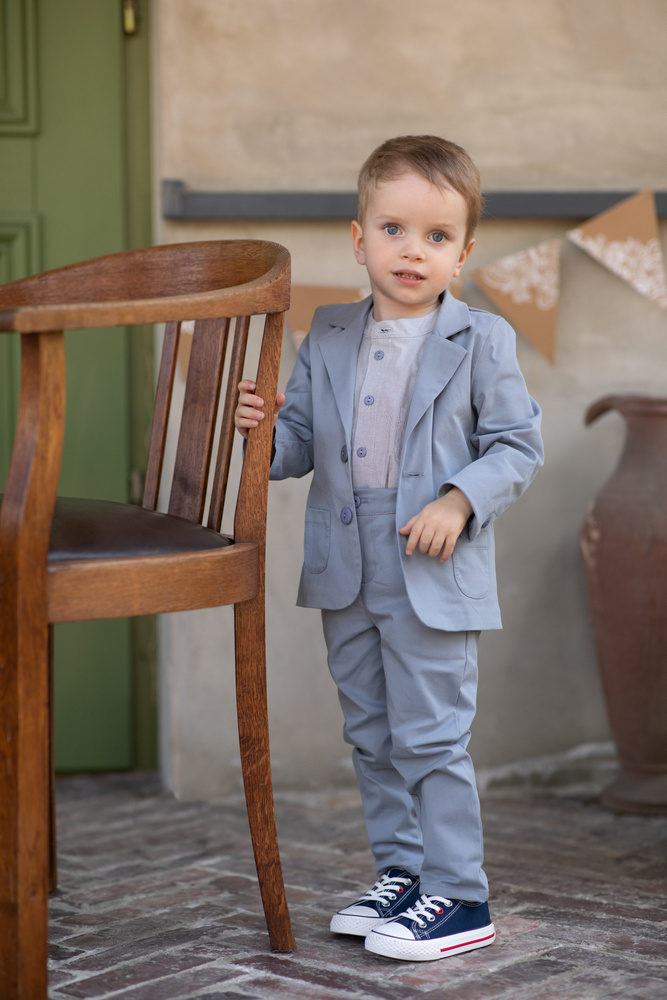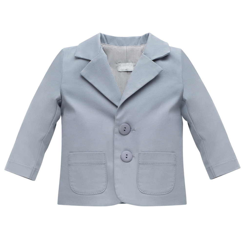 Delikatna chłopięca marynarka z funkcjonalnymi kieszeniami. Idealnie łączy się z pozostałymi ubrankami z kolekcji Charlie..