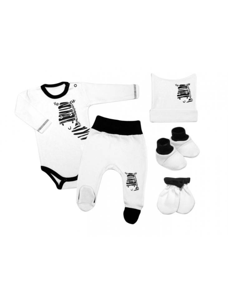 Zestaw wyprawkowy, który składa się z body, półśpiocha, łapek niedrapek, bucików i czapki. Ubranka z 100% bawełny, ozdobione sitodrukiem.