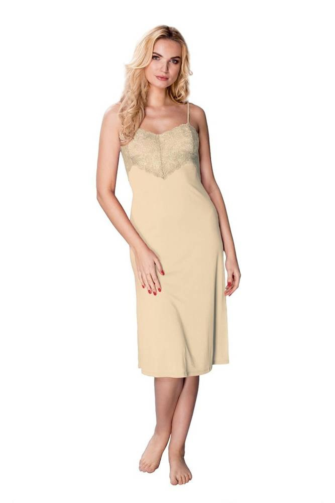 Koszula nocna o długości “midi”, wykonana z lekkiej dzianiny wiskozowej oraz kobiecej koronki, która nadaje jej eleganckiego charakteru. Góra koszuli uszyta z elastycznej koronki w kształcie ponętnego karczku, z głębokim dekoltem, na cienkich, regulowanych ramiączkach. Dół prosty, lekko dopasowany do sylwetki, co czyni ją jeszcze bardziej elegancką.