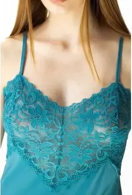 Koszula nocna o długości “midi”, wykonana z lekkiej dzianiny wiskozowej oraz kobiecej koronki, która nadaje jej eleganckiego charakteru. Góra koszuli uszyta z elastycznej koronki w kształcie ponętnego karczku, z głębokim dekoltem, na cienkich, regulowanych ramiączkach. Dół prosty, lekko dopasowany do sylwetki, co czyni ją jeszcze bardziej elegancką.