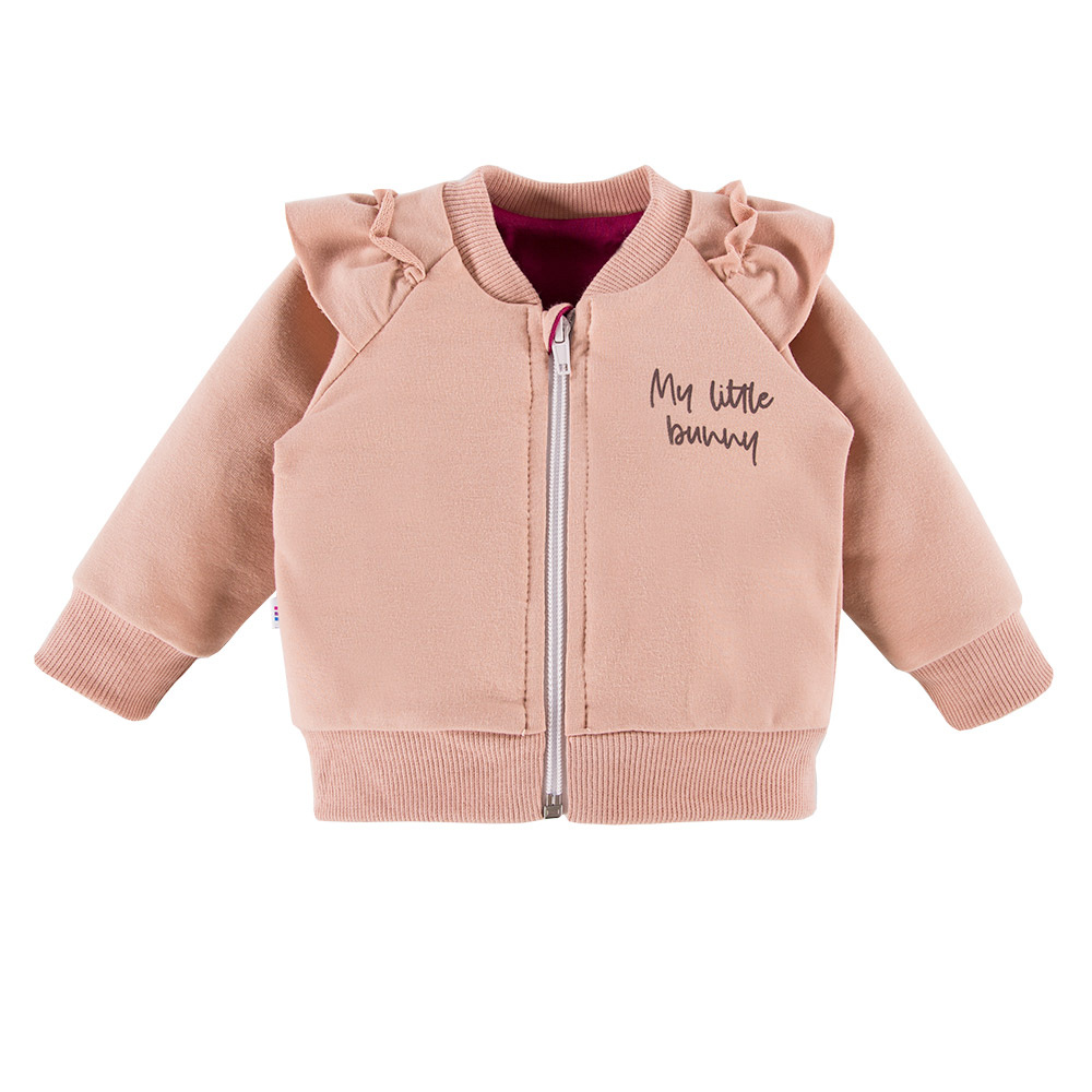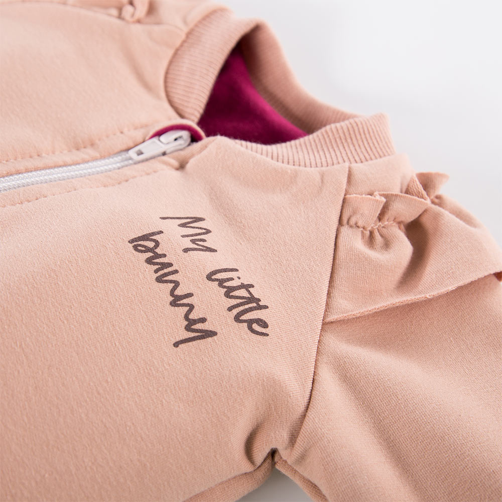 Bluza z kapturem jest rozpinana na zamek. Spodnie posiadają w pasie gumę.