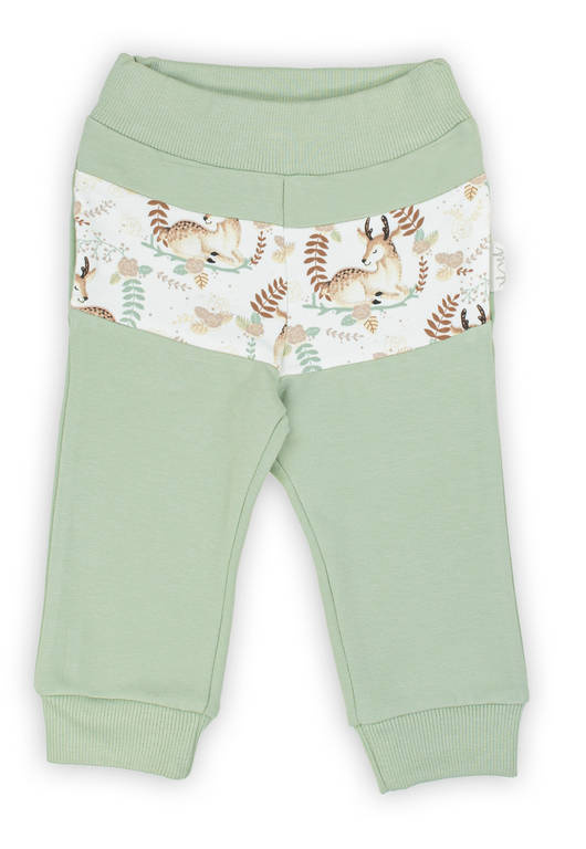 Spodnie uszyte z bawełny dresowej w motywy roślinne z domieszką elastanu, co powoduje, że materiał nie odkształca się a zarazem jest miły w dotyku. W pasie posiadają wygodną gumkę nie uciskającą brzuszka. Ubranko charakteryzuje wygodny fason, nogawki zostały zakończone ściągaczami pod kolor spodenek.