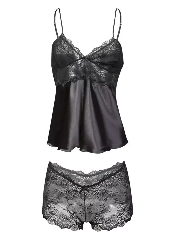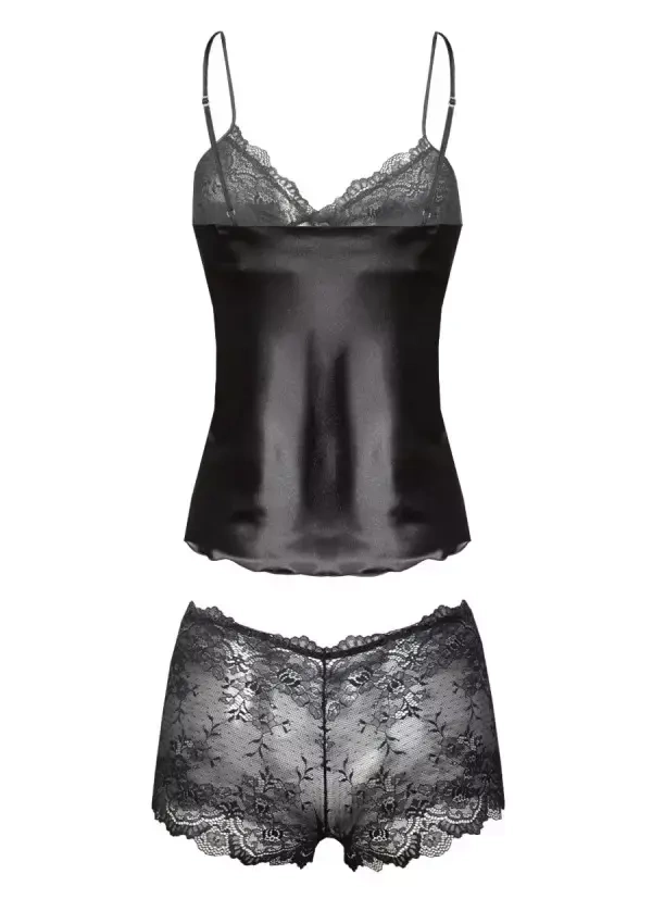Seksowny, zmysłowy dwuczęściowy komplet składający się z koszulki oraz bokserek. Góra koszulki została uszyta z elastycznej zmysłowej koronki natomiast dół został wykonany z delikatnej satyny. Koszulka posiada cienkie, regulowane ramiączka. Bokserki zostały wykonane z elastycznej delikatnej koronki, która z całością tworzy niezapomniany komplecik.
