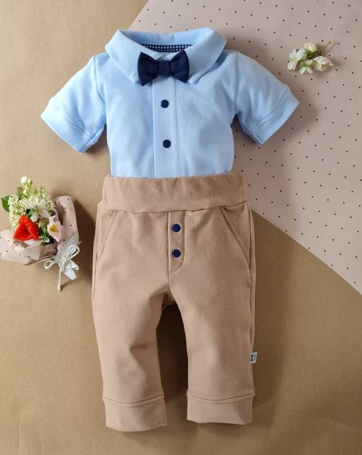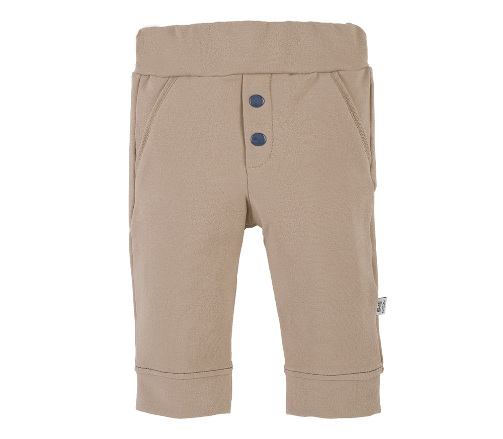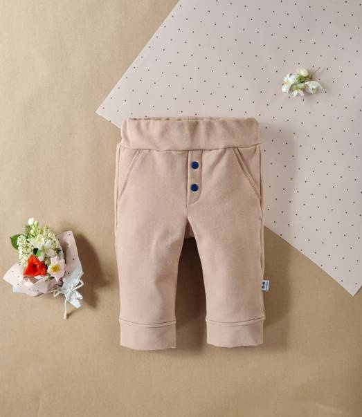 Wygodne spodnie w kolorze latte. Wykonane ze 100% bawełny. Posiadają ozdobne przeszycia imitujące kieszonki po bokach. Szerokie ściągacze w pasie i na nóżkach zapewniają odpowiednie przyleganie, jednocześnie nie krępując ruchów dziecka. Ich stonowany kolor i prosty krój pozwala stworzyć wiele stylizacji w zależności od okazji.