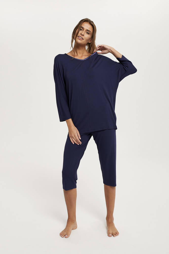 Delikatna piżama damska z rękawem i nogawką o długości 3/4. Wykonana z wiskozy wzbogaconej elastanem. Dostępna w kolorze granatowym. Piżama pięknie prezentuje kobiecą sylwetkę, uwydatniając jej atuty. Góra piżamy została uatrakcyjniona ciekawym przeszyciem na środku przodu, zaś dekolt został wykończony atłasową lamówką w kolorze granatowym, dodając eleganckiego sznytu całości.