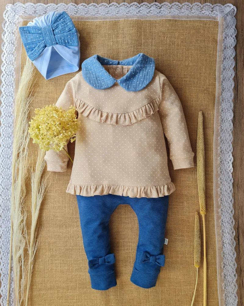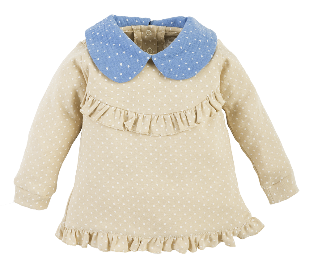 Urocza tunika z kolekcji Sophie. Posiada ozdobną falbankę i kołnierzyk. Wykonana z miękkiej i wygodnej bawełny 100%. Zapinana jest na antyalergiczne napki co ułatwia ubieranie.