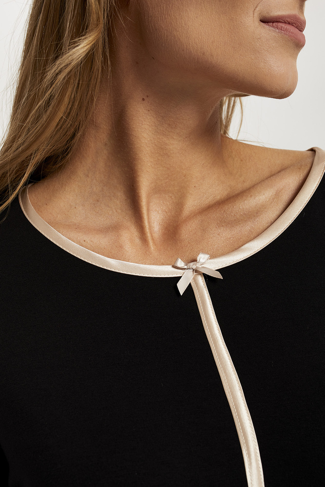 Kobieca, a jednocześnie funkcjonalna piżama damska z długim rękawem i długimi spodniami. Piżama posiada okrągły dekolt i atłasowy kontrastowy lampas przez środek. Przy szyi bluzka wykończona została uroczą kokardą. Do kompletu długie spodnie wykończone gumką u dołu. Piżama dzięki zastosowaniu wiskozy wzbogaconej elastanem jest idealna na chłodniejsze wieczory.