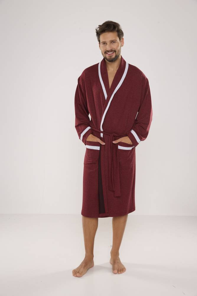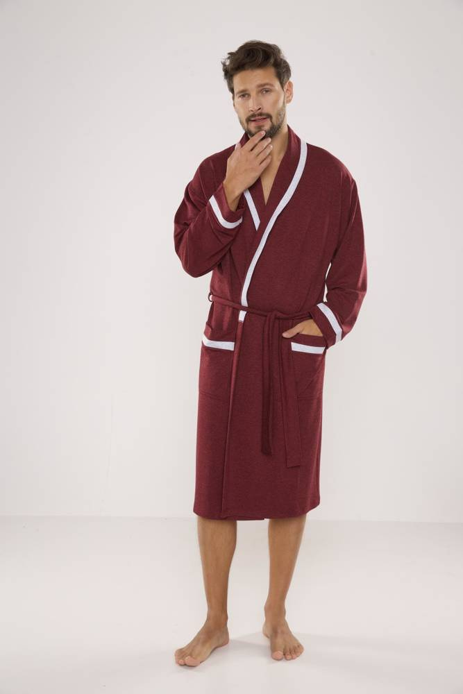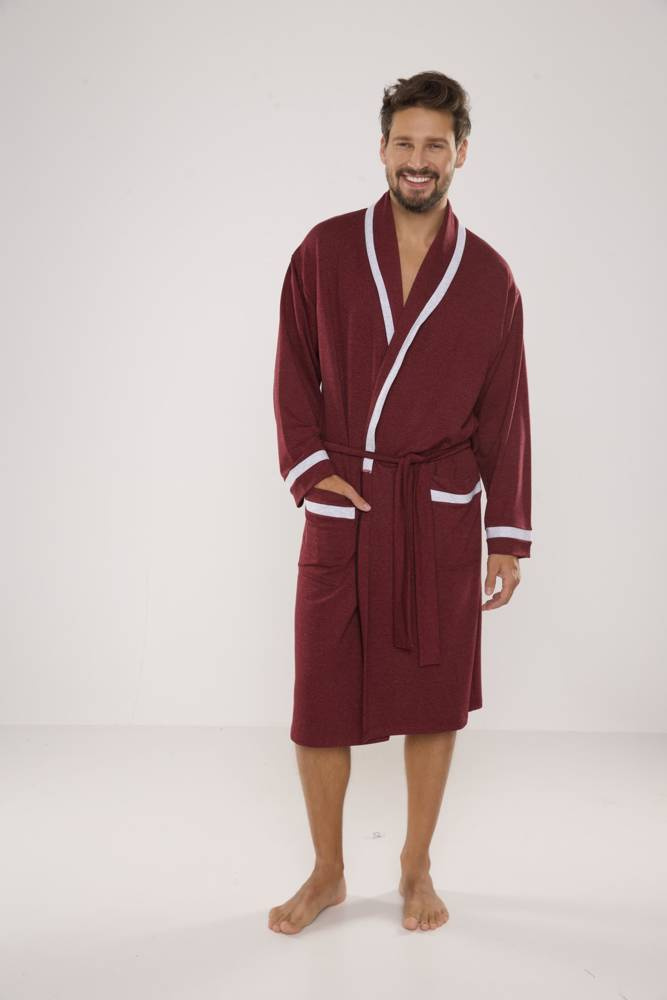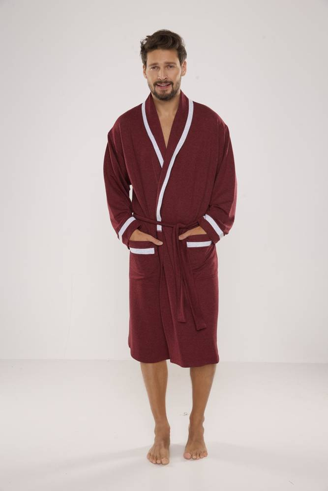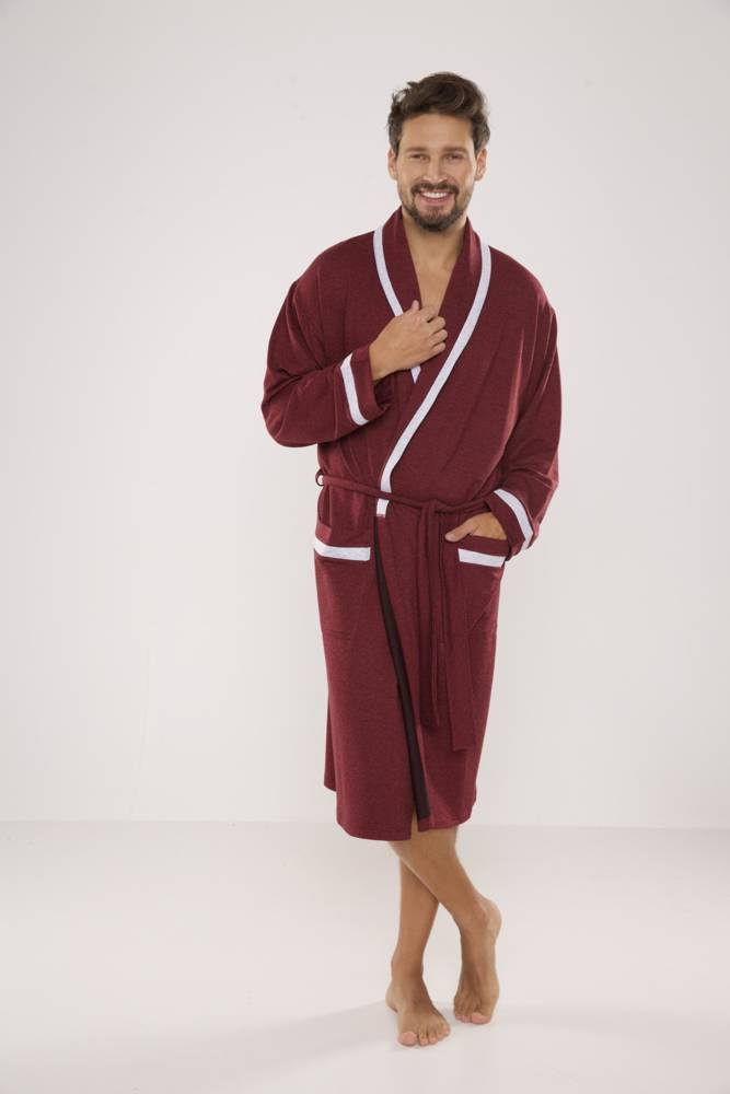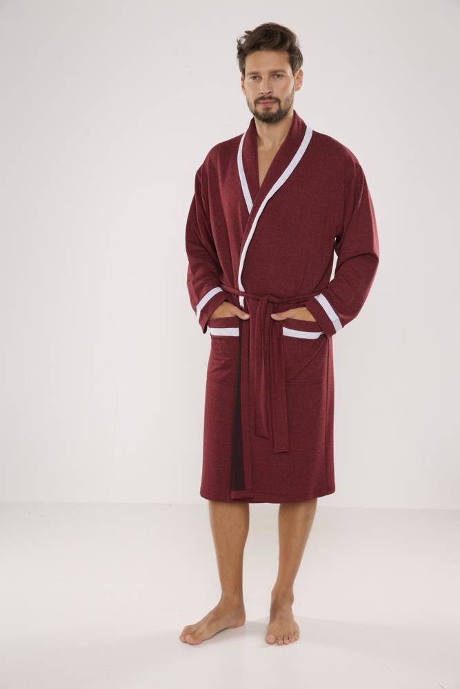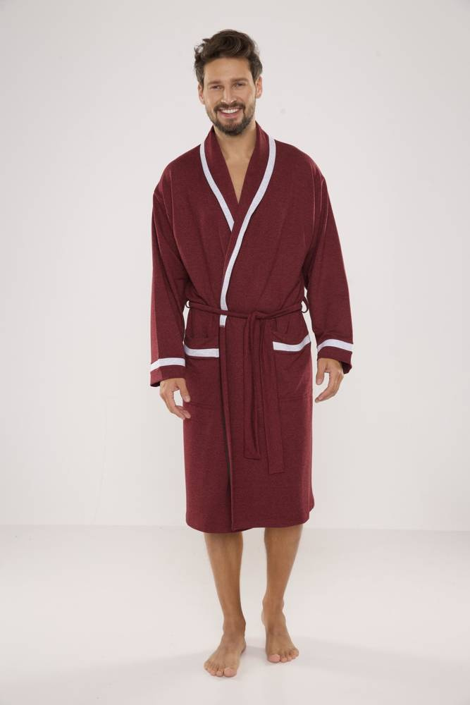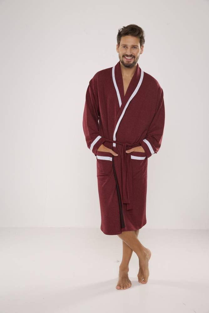 Mamy do zaoferowania ekskluzywny długi szlafrok z kołnierzem, wiązany w pasie.