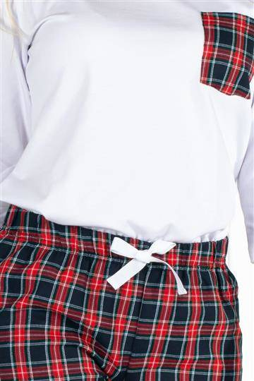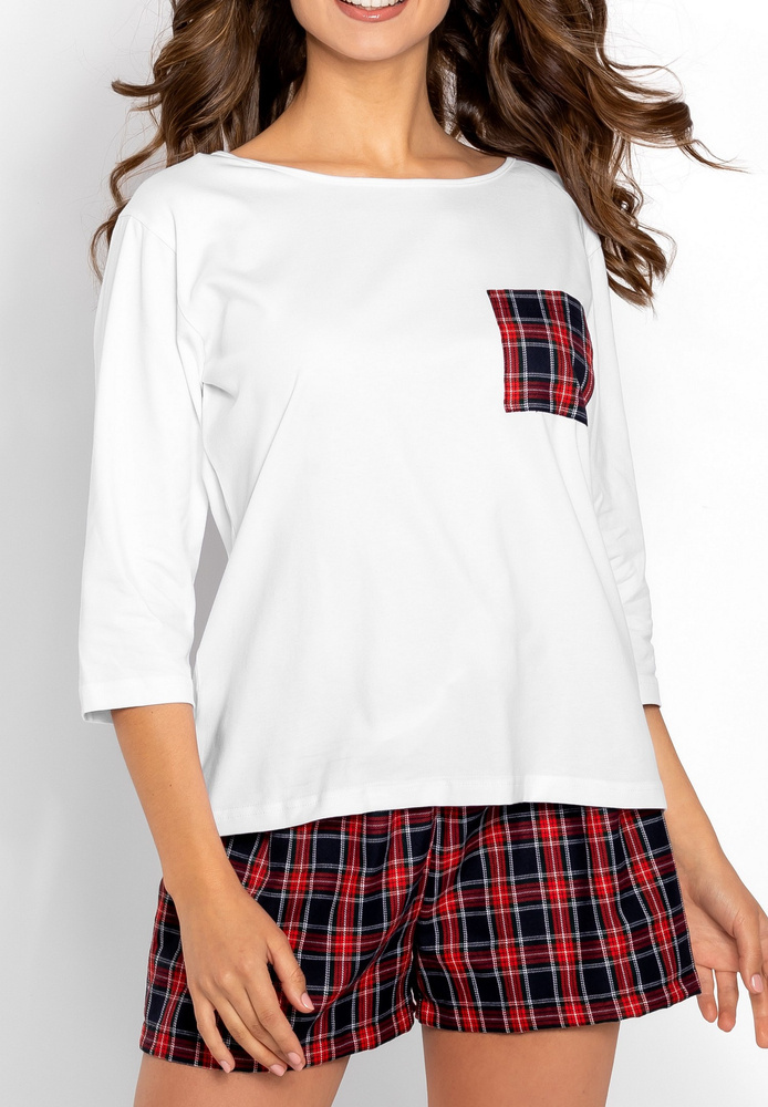 Piżama damska wykonana z przyjemnej w dotyku, miękkiej dzianiny. Dekolt typy U. Na wysokości piersi znajduje się kieszonka. Luźny, komfortowy krój, w pasie ozdobna kokardka.