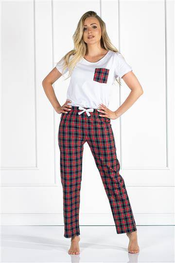 Piżama damska wykonana z przyjemnej w dotyku, miękkiej dzianiny. Dekolt typy U. Na wysokości piersi znajduje się kieszonka. Luźny, komfortowy krój, w pasie ozdobna kokardka.