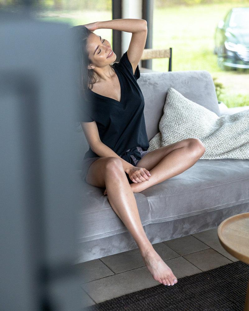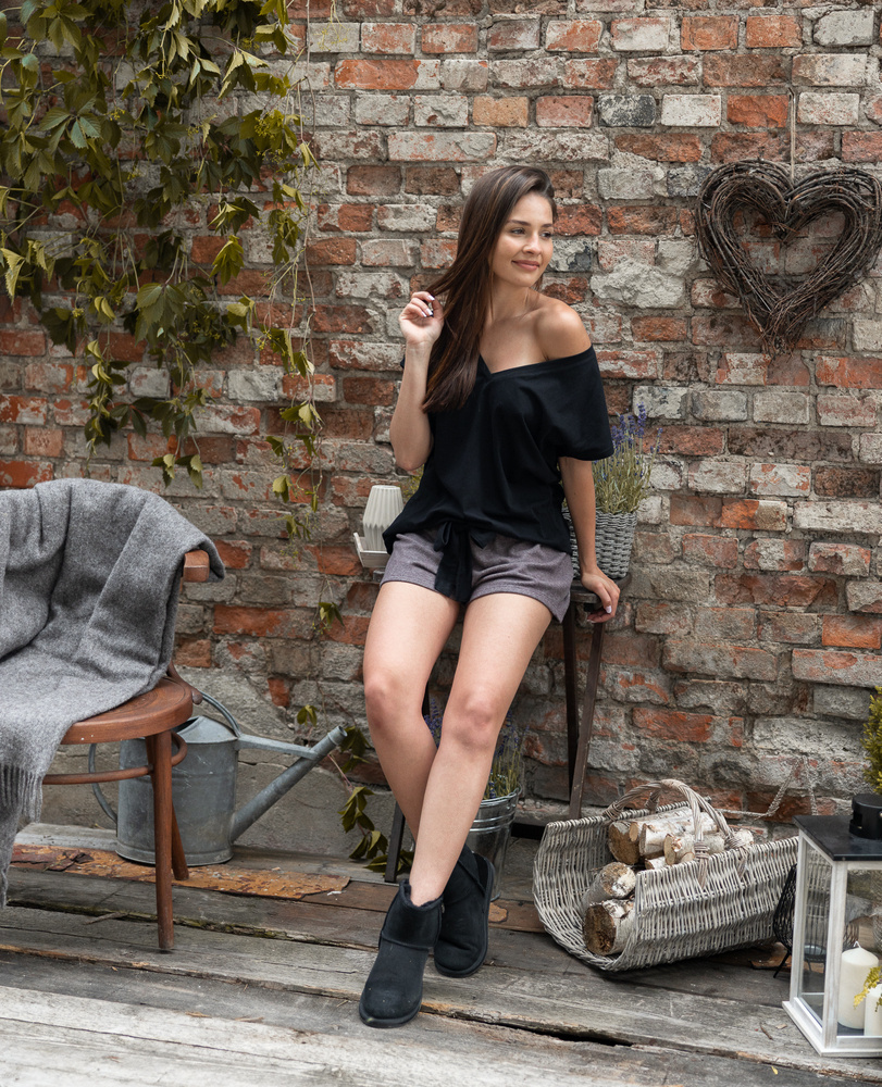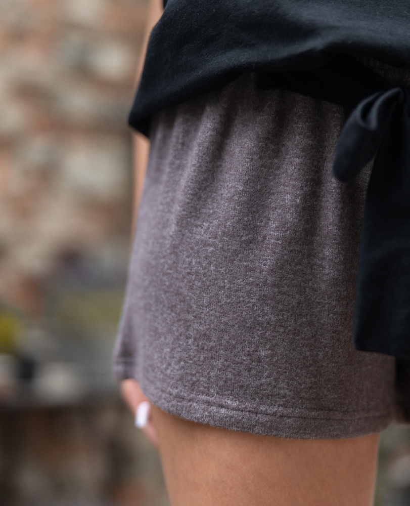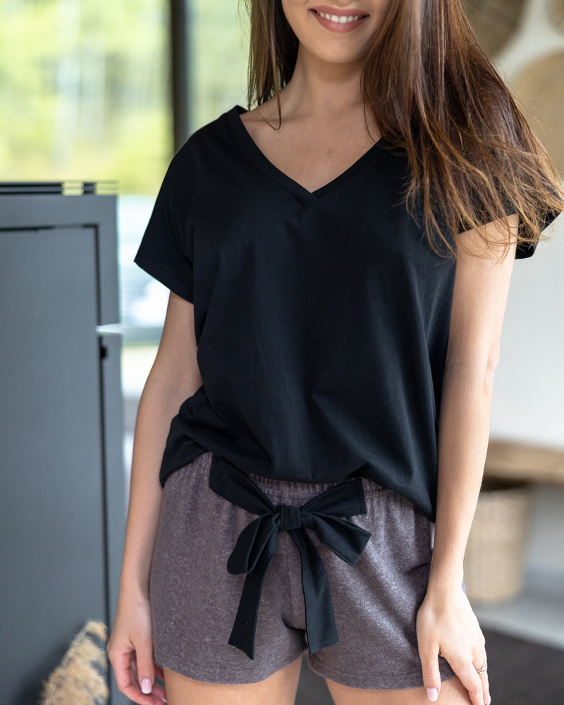 Wyjątkowa piżama damska - wygodna i efektowna. Góra to bawełniana bluzeczka z dekoltem w kształcie litery V. Do tego urocze, krótkie spodenki Wykonane z miękkiej, wiskozowej dzianiny. W pasie wygodna gumka oraz wiązanie.