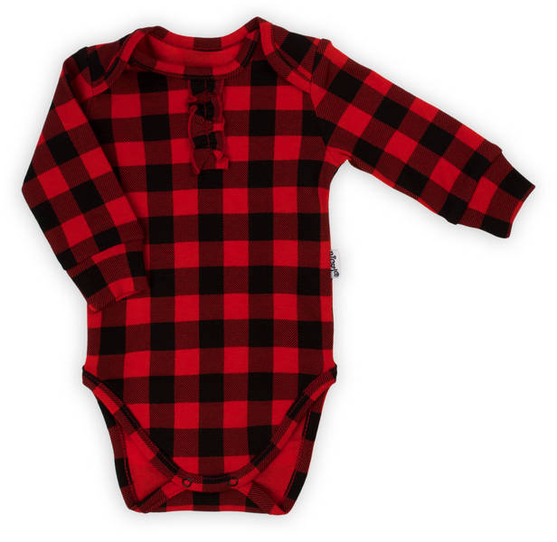 Body z długim rękawem dla dziewczynki, uszyte z bawełny w kratkę, czarno-czerwoną, posiadającej certyfikat Oeko-Tex Standard 100 Tekstylia godne zaufania. Ubranko zdobi marszczona falbanka na przodzie. Rękawy zakończone ściągaczem pod kolor. Ramionka na zakładkę, przez co główka łatwo przechodzi. Body rozpinane są w kroku, co ułatwia wygodną zmianę pieluszki.
