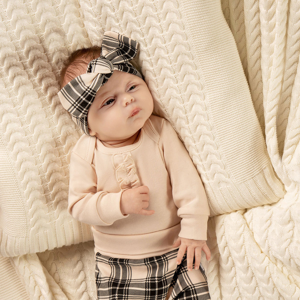 Body z długim rękawem dla dziewczynki, uszyte z bawełny, posiadającej certyfikat Oeko-Tex Standard 100 Tekstylia godne zaufania. Ubranko zdobi marszczona falbanka na przodzie. Rękawy zakończone ściągaczem pod kolor. Ramionka na zakładkę, przez co główka łatwo przechodzi. Body rozpinane są w kroku, co ułatwia wygodną zmianę pieluszki.