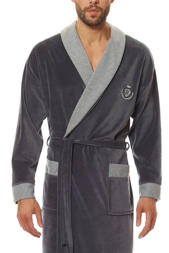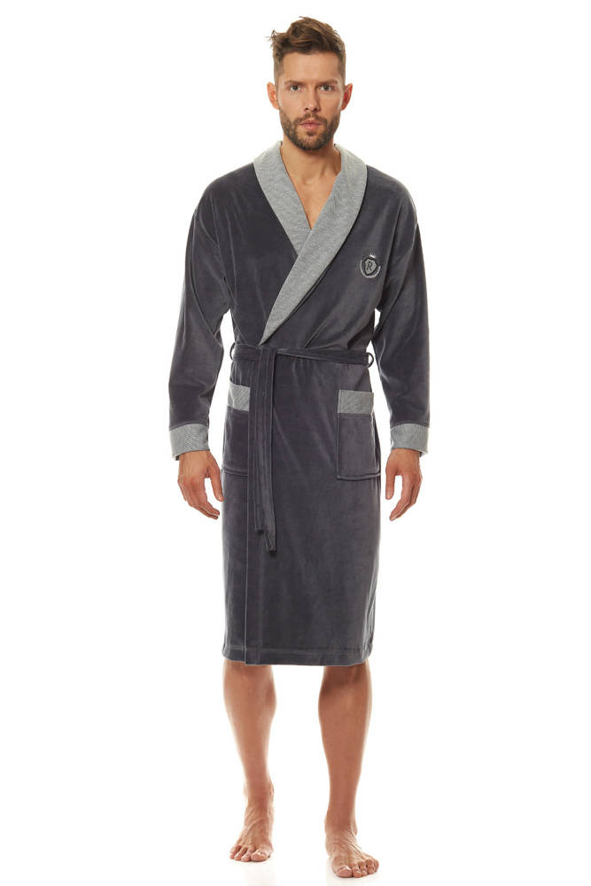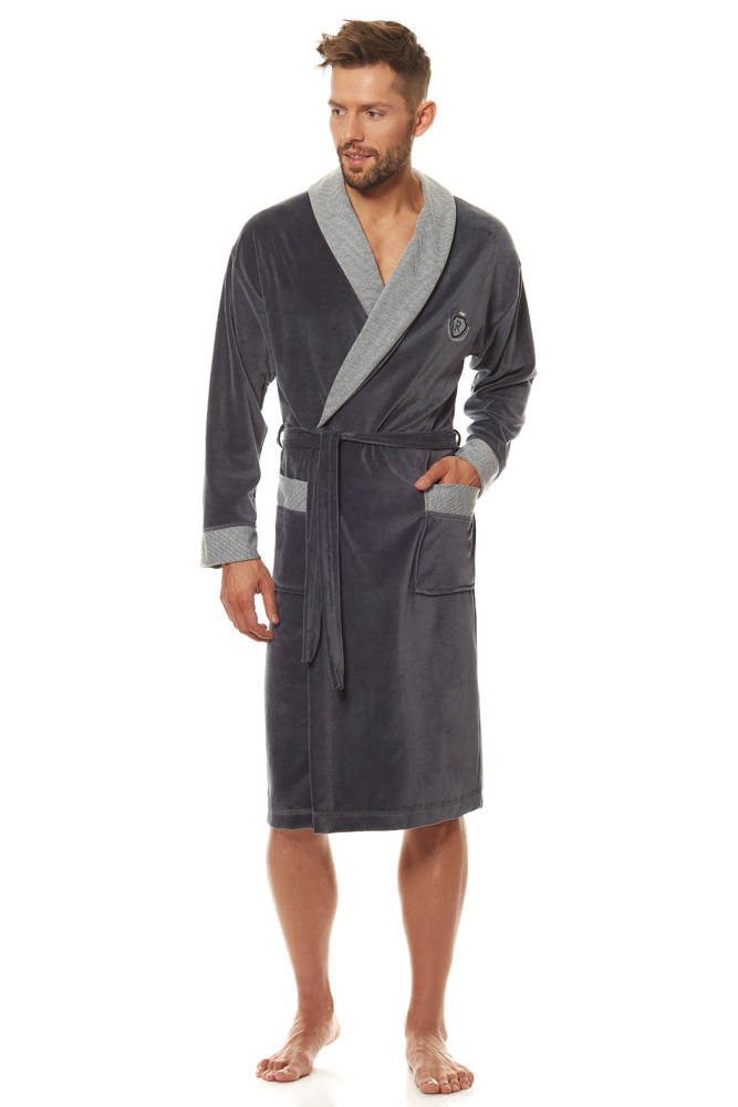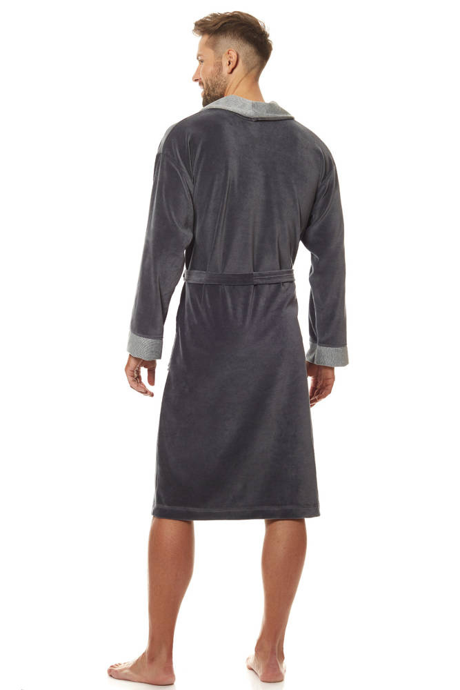 Welurowy szlafrok męski, długi z szalowym kołnierzem, wiązany w pasie.