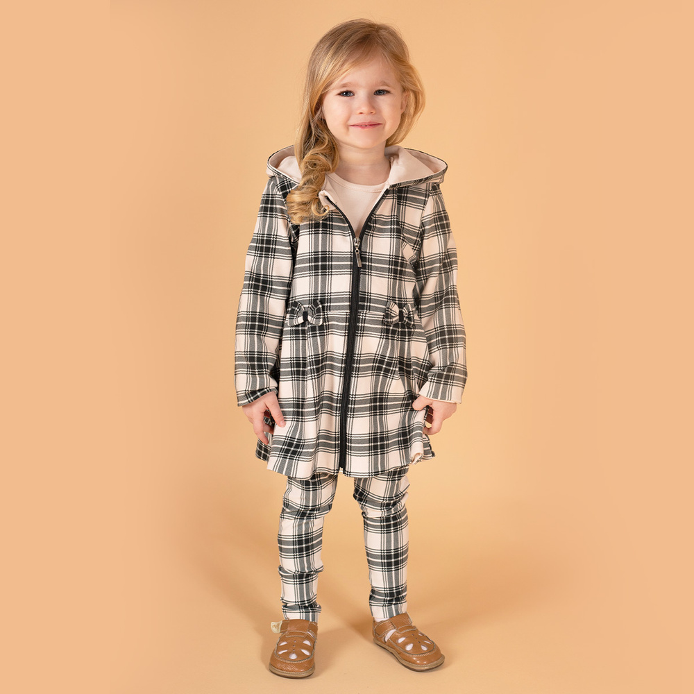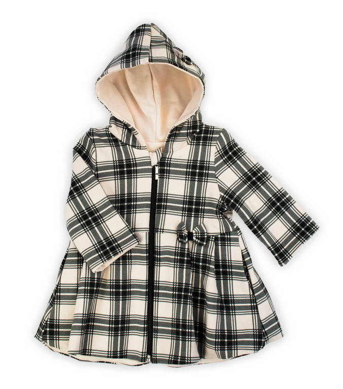 Płaszczyk wykonany z bawełny. Ubranko idealnie nadaje się na chłodne dni. Całość zdobi kaptur oraz kieszonki. Materiał jest całkowicie bezpieczny dla skóry dziecka.