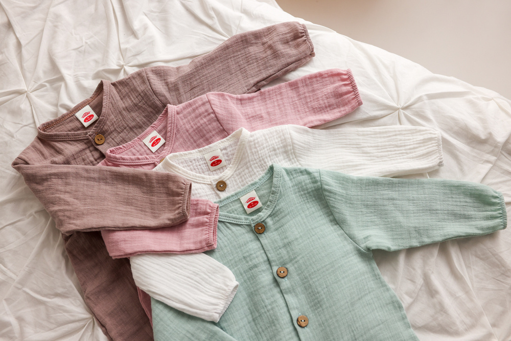 Bawełniany pajacyk niemowlęcy rozpinany na całej długości na napki- co ułatwia przewijanie dziecka.