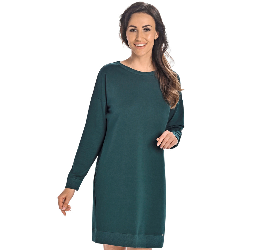 Sukienka damska o klasycznym kroju. Wysokiej jakości przewiewna bawełna gwarantuje komfortowe użytkowanie. Sukienka po bokach z obu stron posiada dwie wpuszczane kieszonki, a długością sięga do kolan. Dołem wykończona jest szerszym elastycznym ściągaczem, to samo wykończenie jest na rękawach, które są długie i idealnie przylegają do rąk. Wokół szyi sukienka wykończona jest estetycznie na półokrągło. Z lewej strony przy nodze z przodu naszyte jest delikatne logo firmy. Sukienka bawełniana jest adresowana do kobiet lubiących proste fasony i kochających wygodę.