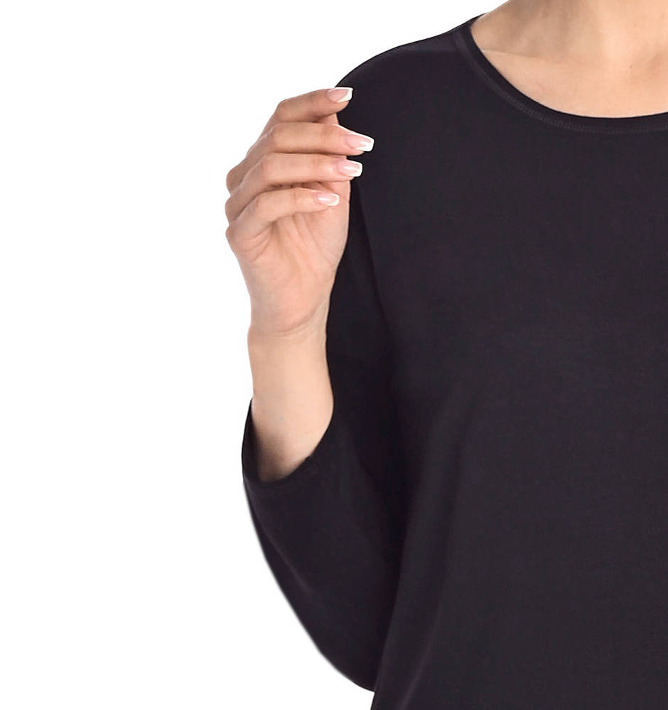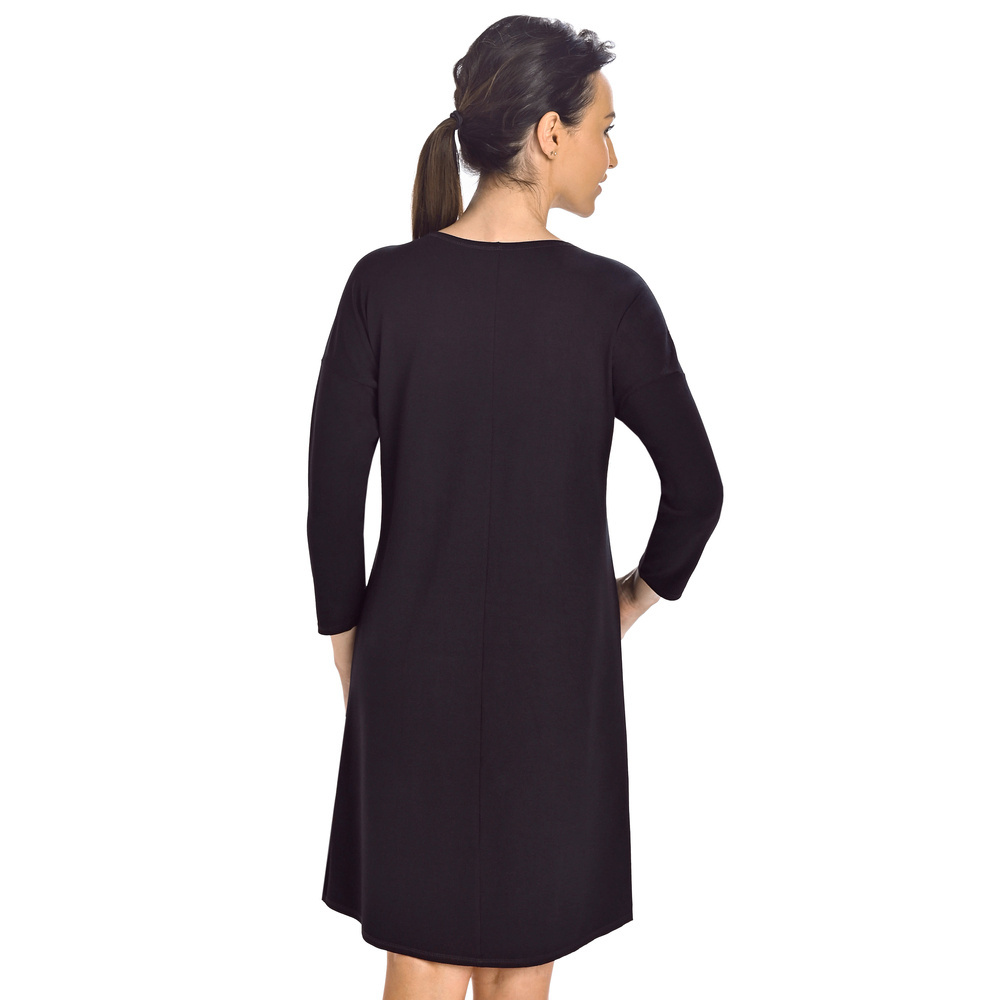 Damska koszula nocna w kolorze czarnym. Wykonana jest z wysokiej jakości przewiewnej wiskozy z dodatkiem elastycznego włókna lycry. Koszula posiada długi lekko dopasowany rękaw, wokół szyi wykończona jest bardzo estetycznie na półokrągło. Długością koszula sięga przed kolano, posiada lekko rozkloszowany fason w kształcie literki A. Koszula nocna jest bardzo wygodna i zapewnia dobry i spokojny sen.