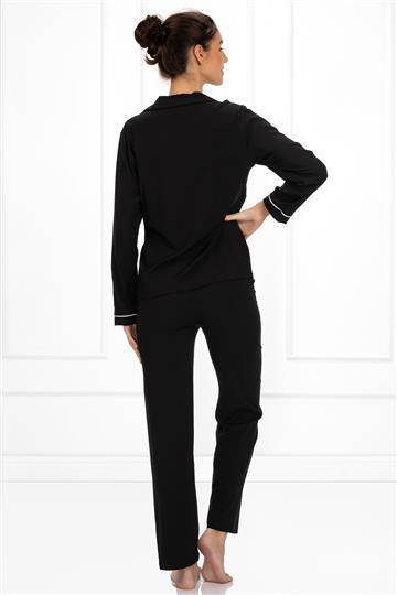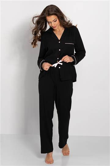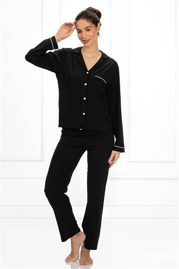 Piżama damska wykonana z przyjemnej w dotyku, miękkiej dzianiny. Tkanina jest odpowiedniej gramatury dzięki temu wspaniale się układa, mniej gniecie a krój bez problemów zachowuje swój kształt. Zapinana na guziki, wykończona kołnierzem. Idealnie sprawdzi się do karmienia.