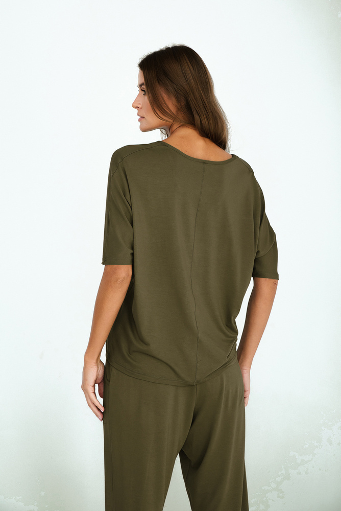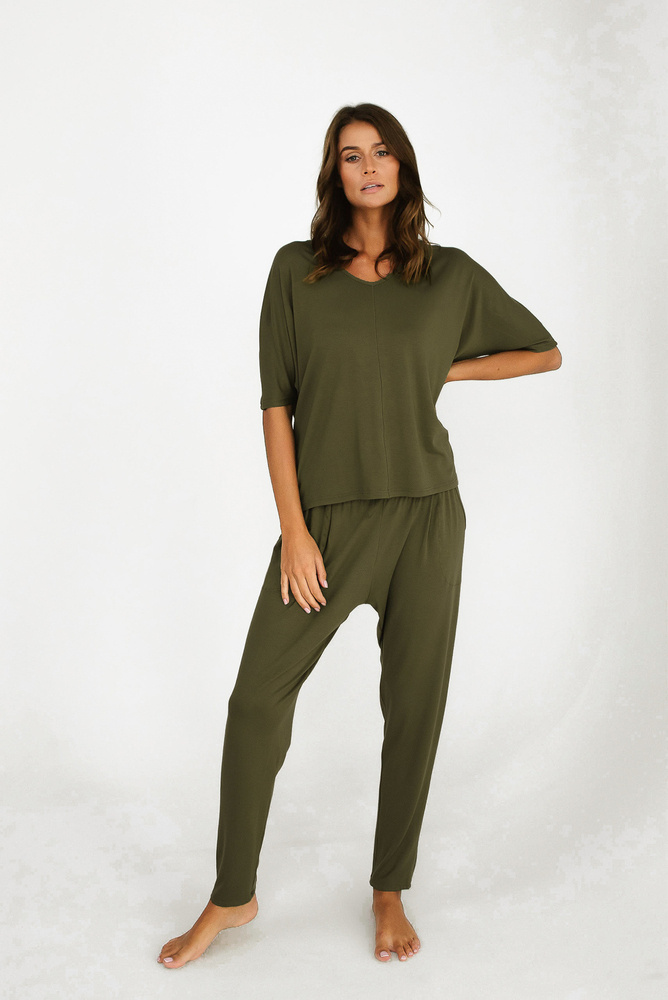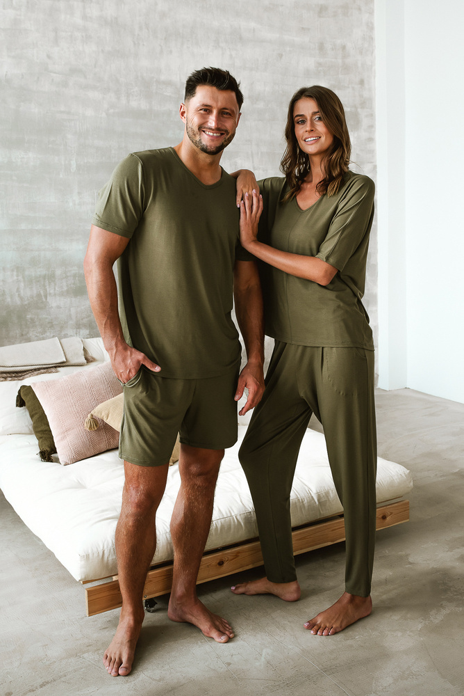 Kolekcja PARAMO z wiskozy świetnie sprawdzi o każdej porze roku. Jej uniwersalność jest wynikiem stonowanego koloru khaki, jak i bardzo dobrze przystosowanego materiału do różnych temperatur. Wiskoza chroni skórę przed zimnem, jednak struktura tej tkaniny jest oddychająca, dzięki czemu skutecznie reguluje temperaturę ciała. Ponadto delikatna i bardzo przyjemna w dotyku wiskoza zapewnia niezwykły komfort podczas snu, który dodatkowo uzyskujemy dzięki bezuciskowej gumce w spodniach i luźnym kroju. Uroku kompletowi dodaje oryginalny i nieco fikuśny fason. To idealny wybór dla osób, które przede wszystkim stawiają na wygodę z klasą.