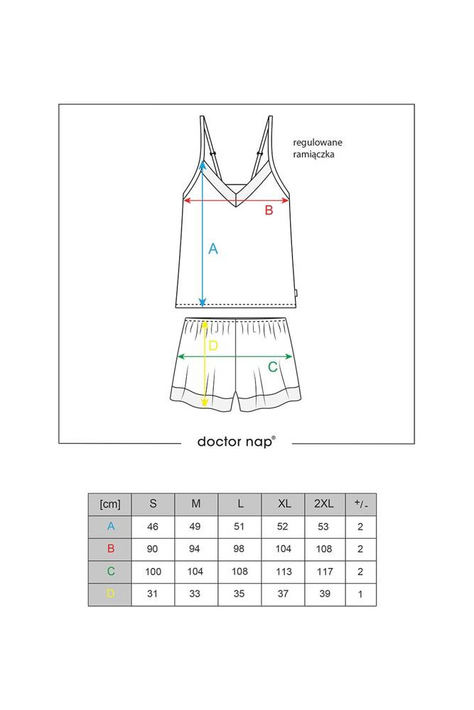 Dwuczęściowa piżamka firmy Doctor Nap wykonana z wysokogatunkowej wiskozy. Idealna na dobry sen i na wspaniały początek dnia przy pierwszej porannej kawie. Luźna bluza na wąskich ramiączkach, nie krępuje ruchów i ładnie podkreśla sylwetkę. Spodnie krótkie, wzorzyste, w pasie wykończone gumką. Przyjemna w dotyku piżama, utrzymana jest w ciekawej kolorystyce.