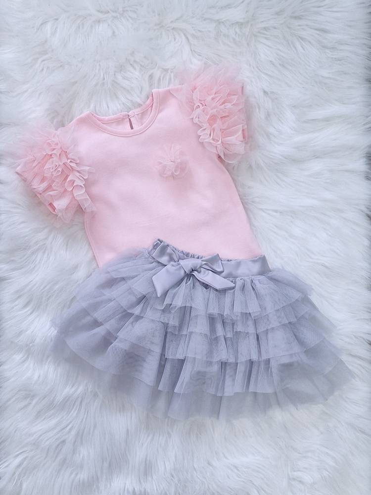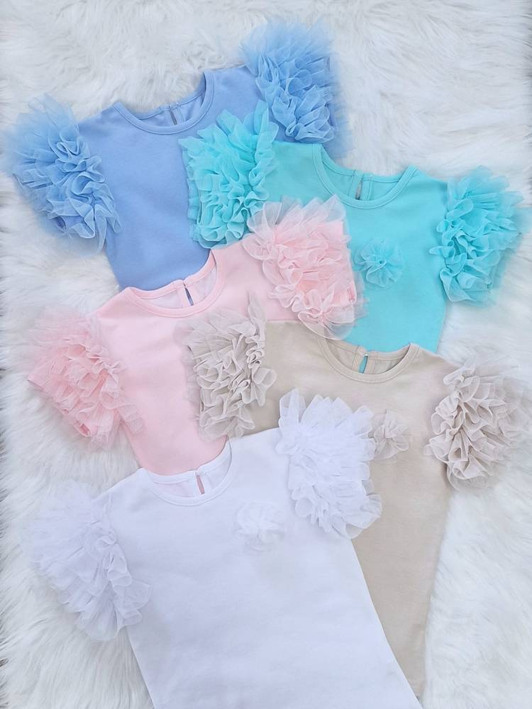 Bluzka dziecięca uszyta z miękkiej i przyjemnej w dotyku bawełny. Ozdobiona tiulowymi rękawkami. Stylizację uzupełnia spódniczka Inez. Modny krój, elegancja i niepowtarzalność!