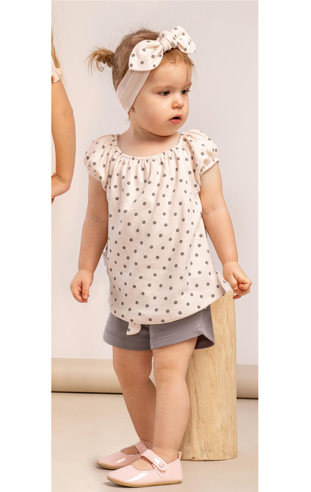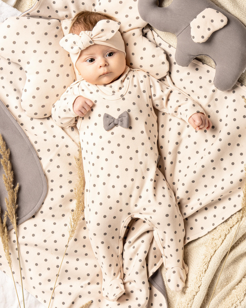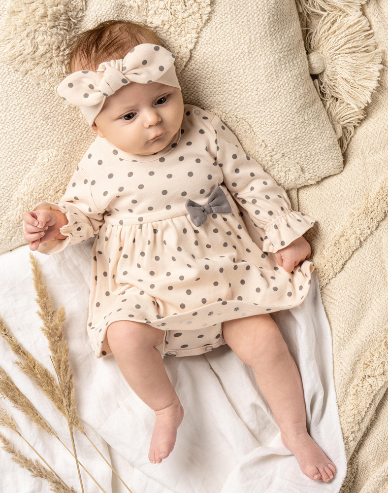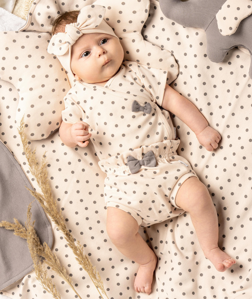 Delikatna, dziewczęca opaska w stylu pin-up. Wykonana z miękkiej bawełny. Będzie doskonałym uzupełnieniem stylizacji. Doskonale komponuje się z pozostałymi ubrankami z kolekcji Sara.