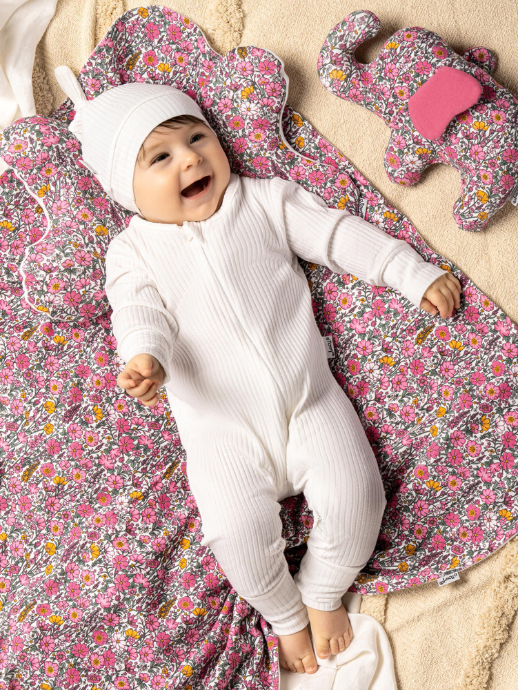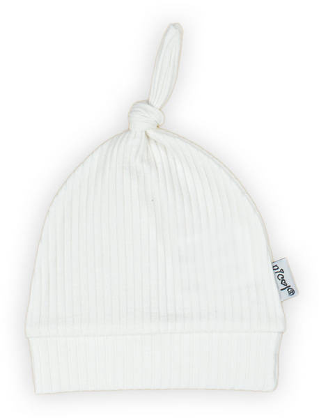 Praktyczna czapka uszyta z kremowej, prążkowanej bawełny. Niewielka ilość elastanu sprawia, że czapeczka będzie lepiej przylegać do główki.W fasonie tym, zastosowano bezuciskowy ściągacz. Materiał posiada certyfikat Oeko-Tex Standard 100 Tekstylia godne zaufania. Czapeczkę na wysokość można regulować supełkiem. Pełni on również funkcję ozdobną.