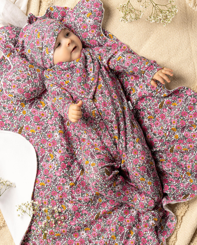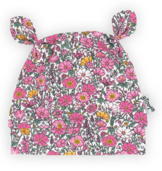 Praktyczna czapka uszyta z drukowanej bawełny. Niewielka ilość elastanu sprawia, że czapeczka będzie lepiej przylegać do główki. Druk przedstawia piękną kolorową łąkę. W fasonie tym, zastosowano bezuciskowy ściągacz. Czapeczkę zdobią uszka w formie zakładek. Materiał posiada certyfikat Oeko-Tex Standard 100 Tekstylia godne zaufania.