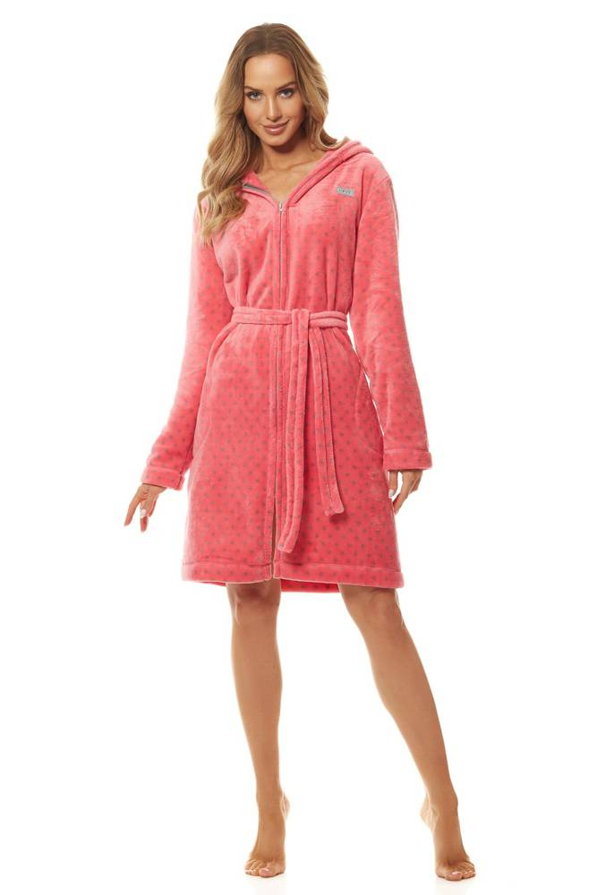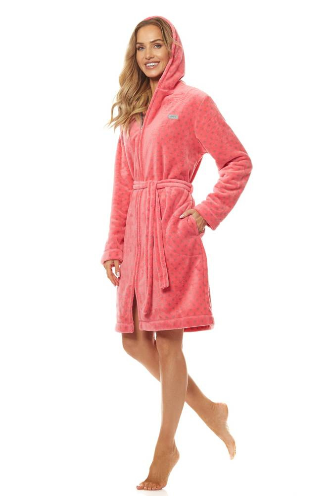 Wygodny szlafrok damski z miękkiej dzianiny w kropki z kapturem.