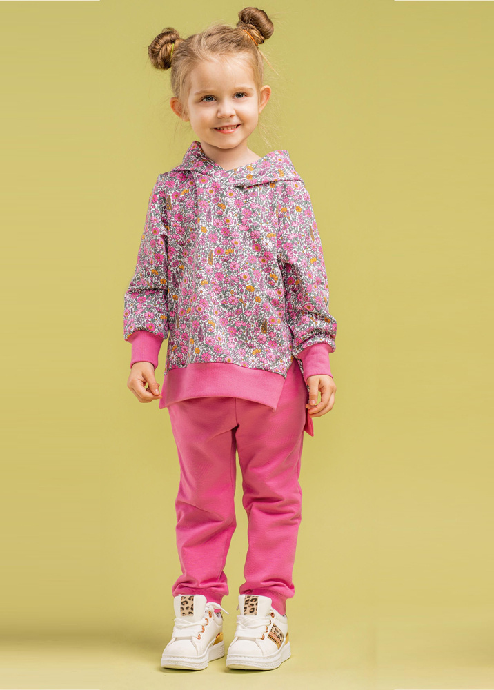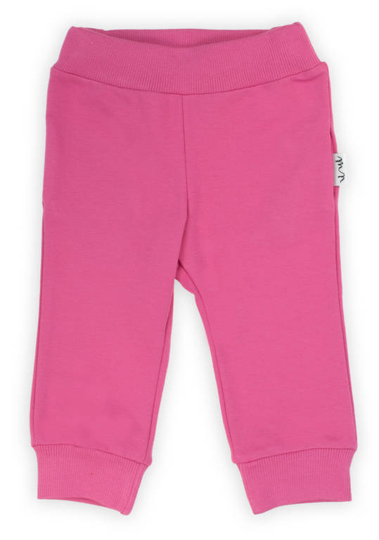 Spodnie uszyte z bawełny dresowej z domieszką elastanu, co powoduje, że materiał nie odkształca się, a zarazem jest miły w dotyku. W pasie posiadają wygodną gumkę nie uciskającą brzuszka. Ubranko charakteryzuje wygodny fason, nogawki zostały zakończone ściągaczami pod kolor spodenek.