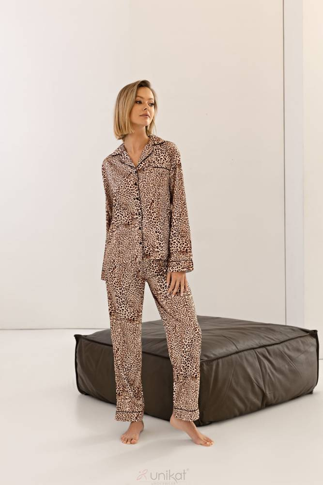 Piżama damska z delikatnej tkaniny satynowej. Koszulka z długim rękawem, rozpinana. Na wysokości piersi ozdobna kieszonka.