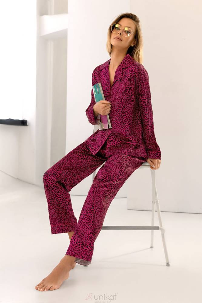 Piżama damska z delikatnej tkaniny satynowej. Koszulka z długim rękawem, rozpinana. Na wysokości piersi ozdobna kieszonka.